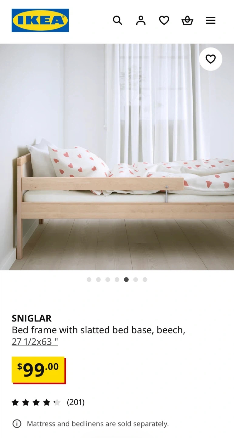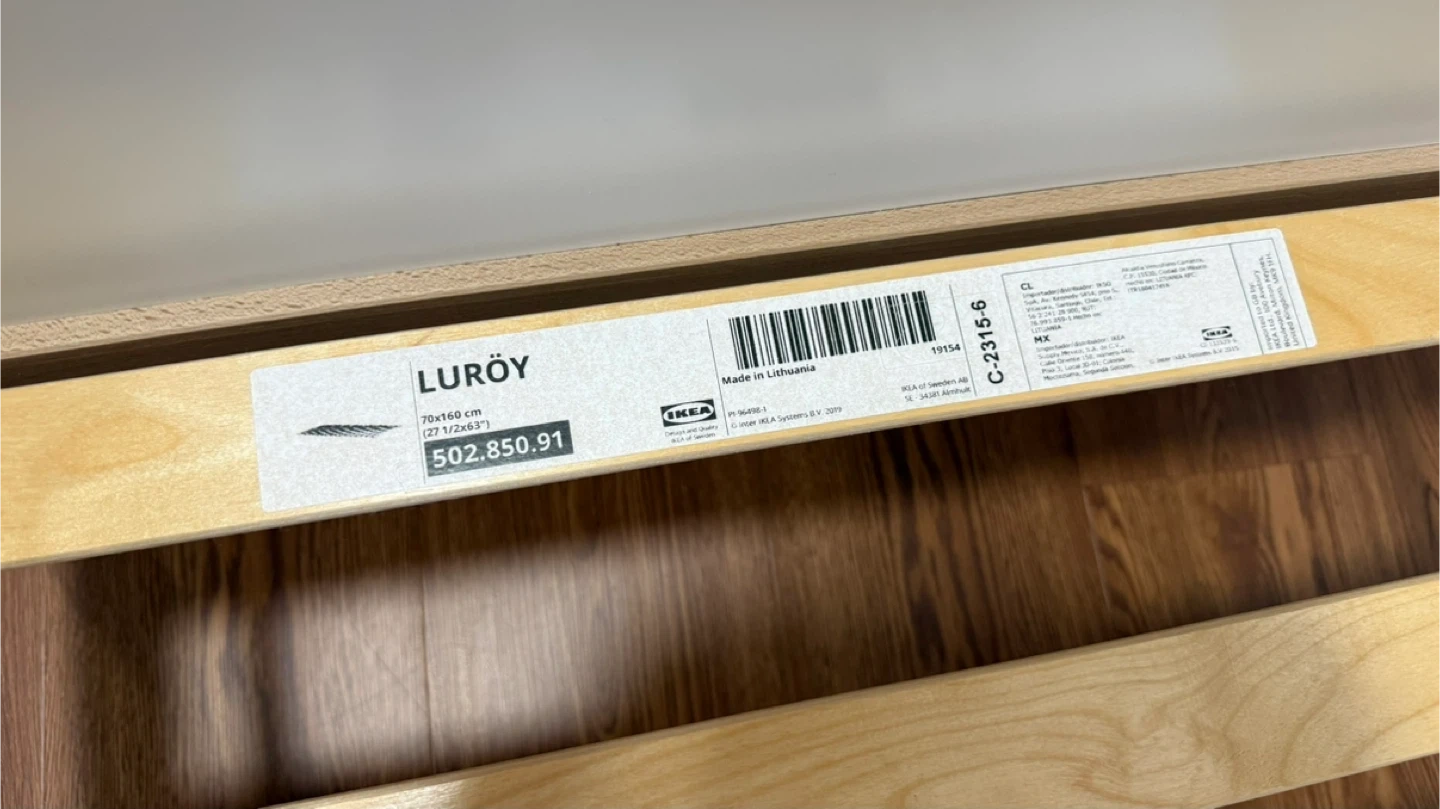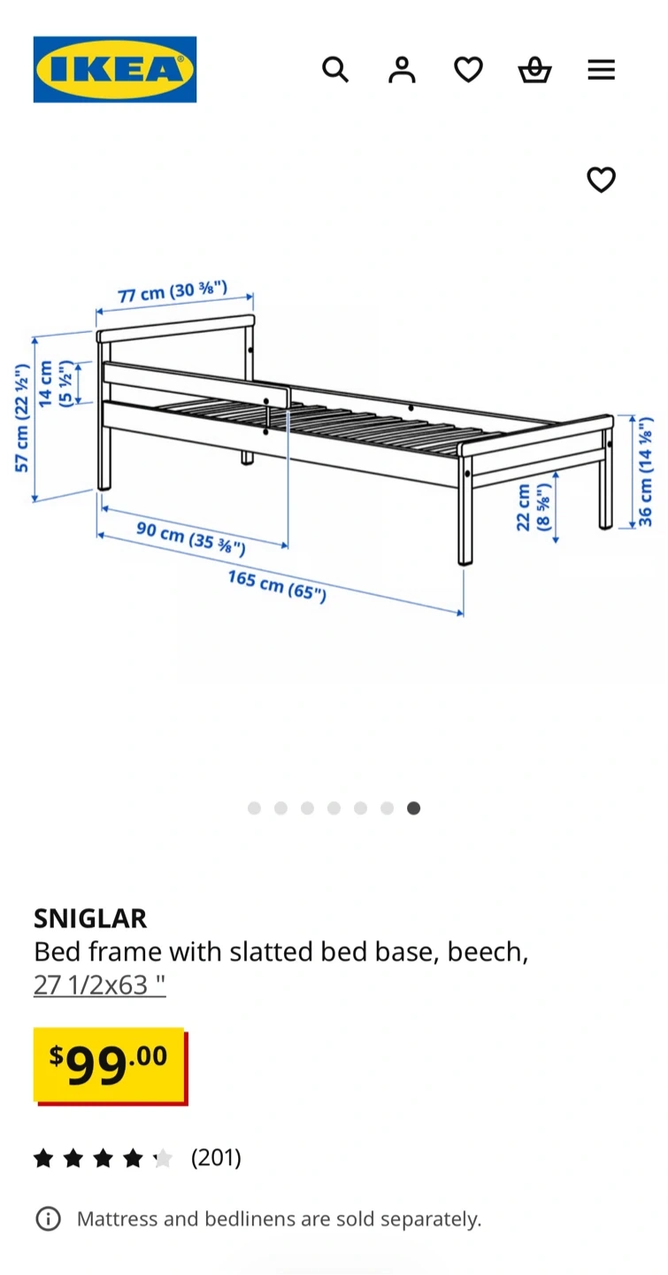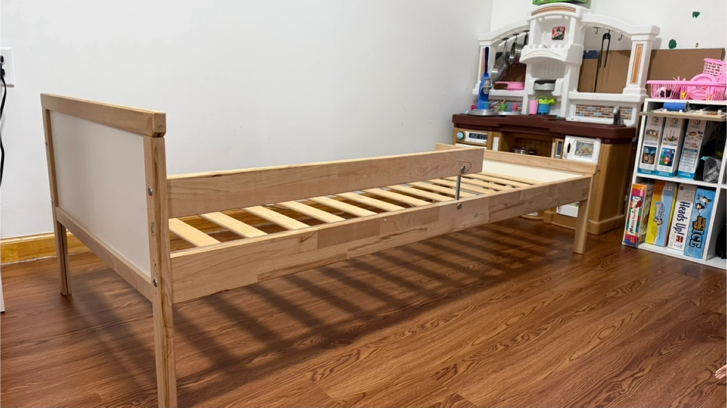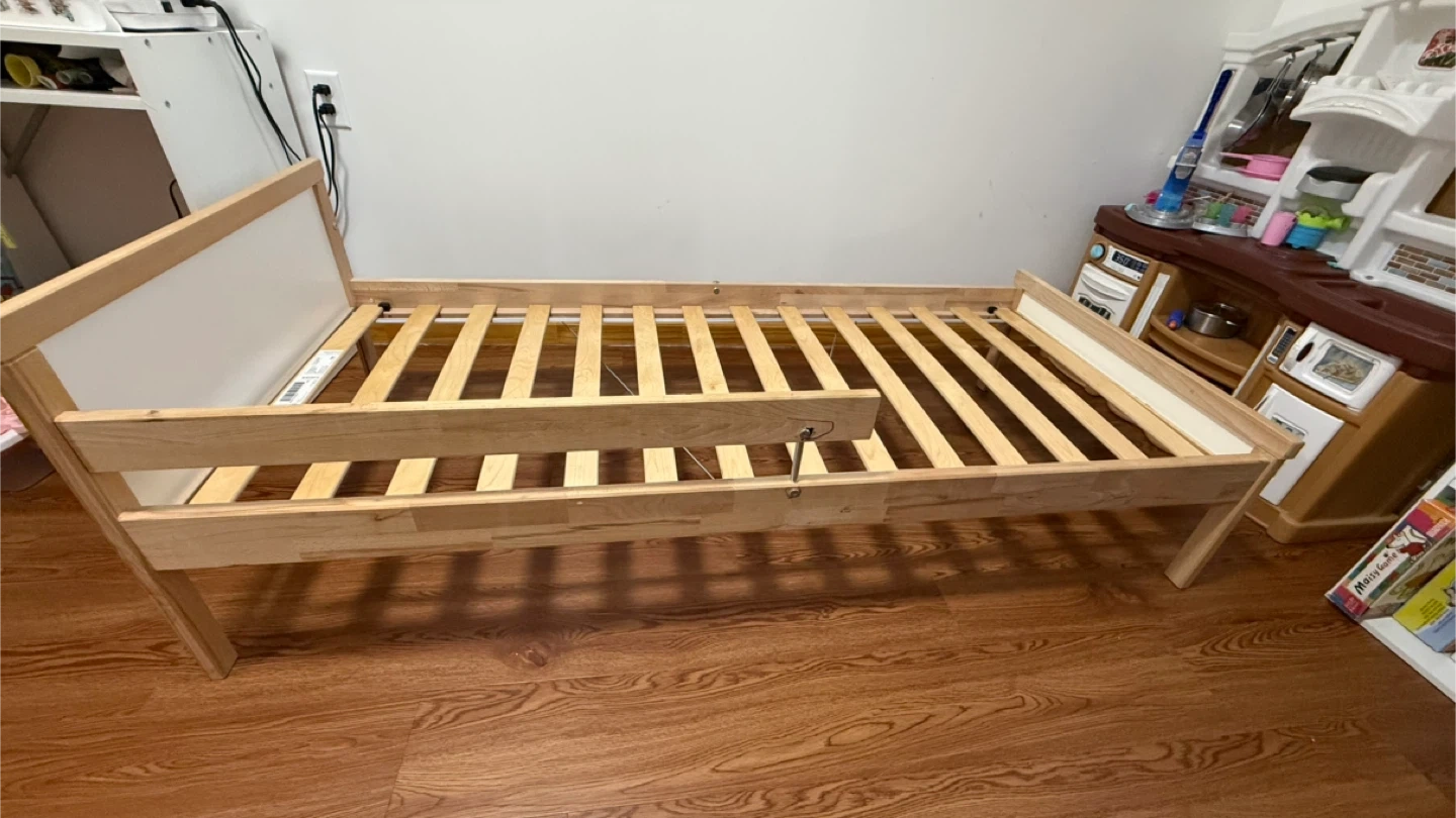This is an IKEA Luroy twin bed frame. It's made of wood and includes the wooden slats for the mattress base. The frame measures 70x190 cm (27 1/2x75 1/4"). This bed's design makes it a good option for a child's room or a guest bedroom. If needed, I can also provide a suitable mattress that was used with a mattress topper.