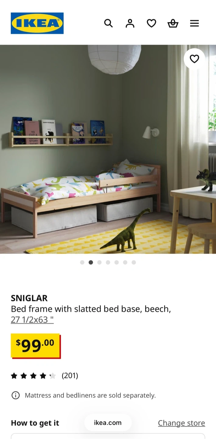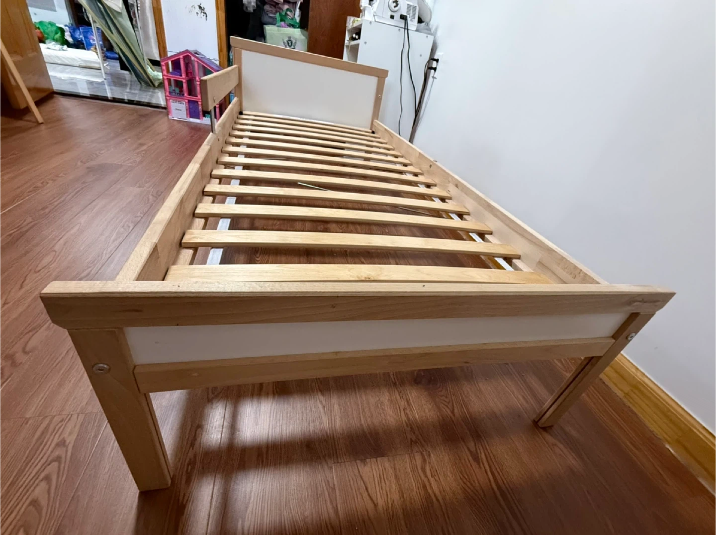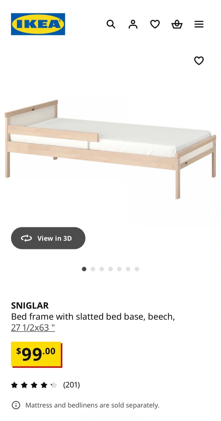 This is an IKEA Luroy twin bed frame. It's made of wood and includes the wooden slats for the mattress base. The frame measures 70x190 cm (27 1/2x75 1/4"). This bed's design makes it a good option for a child's room or a guest bedroom. If needed, I can also provide a suitable mattress that was used with a mattress topper.