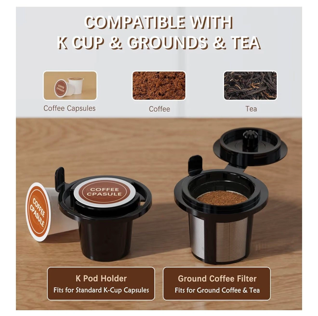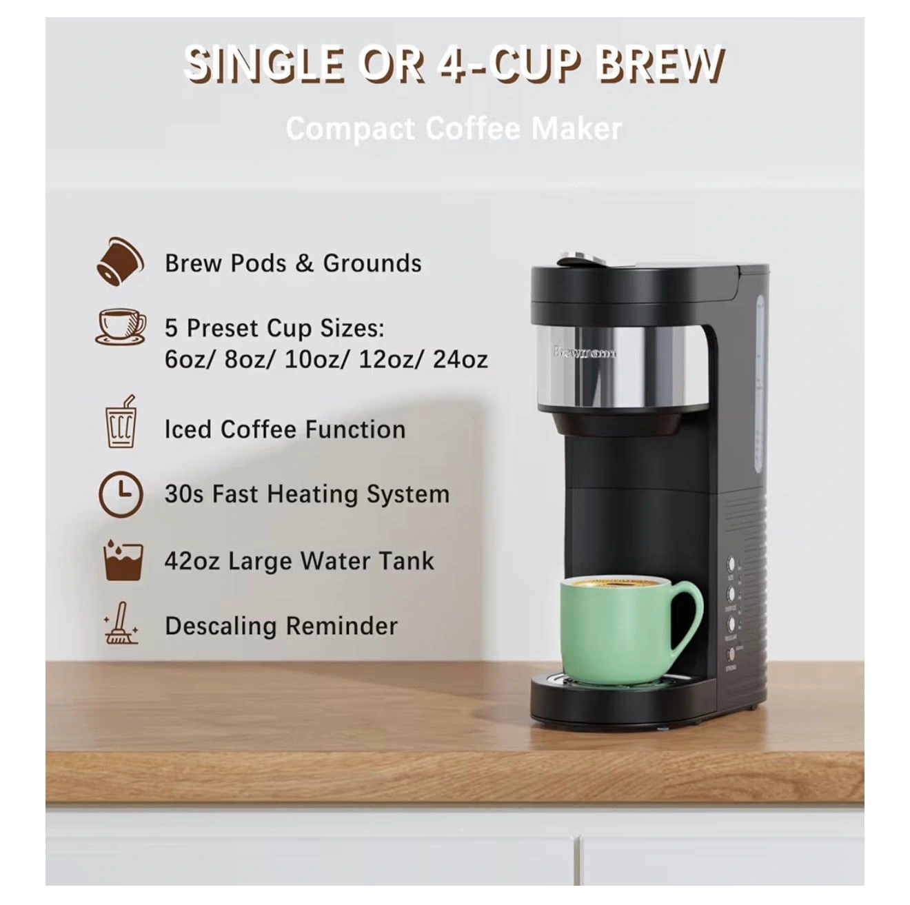 Single Serve Hot & Iced Coffee Maker, for K Cup Pod and Grounds, 6 to 24oz Brew Size, Slim Compact for Small Spaces, Descaling Reminder, with Reusable Filters, Black. Feel free to message if you have any questions!