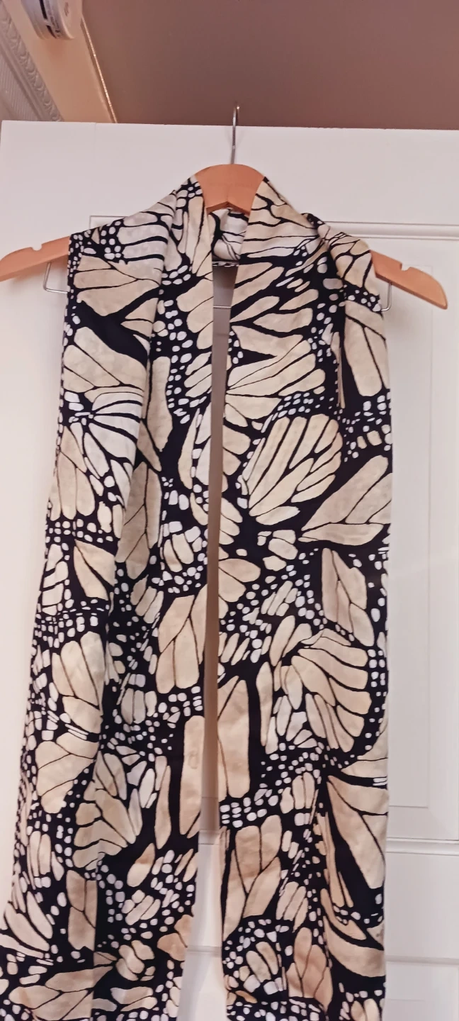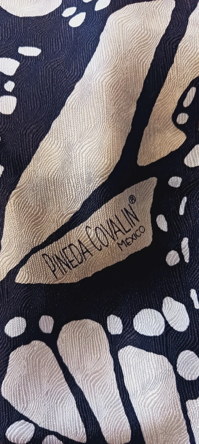 PINEDA COVALIN MEXICAN DESIGNER SIGNED AUTHENTIC 100% SILK ABSTRACT DESIGN SCARF. THIS STRIKINGLY BEAUTIFUL SCARF FROM PINEDA COVALIN DEPICTS ABSTRACT MACRO MONARCH BUTTERFLY DESIGN IN BLACK & BEIGE COLOR.It features a unique butterfly design in black and beige. The material is pure silk and it feels luxurious to the touch. It's in great condition and ready to add a touch of elegance to your wardrobe !! 70"×10". Made in Mexico. Excellent condition, like new. ALL MY PRICES ARE NEGOTIABLE !!!