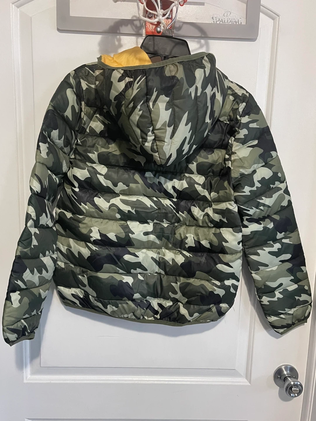 Boys' puffer jacket in a camouflage print with a hood.