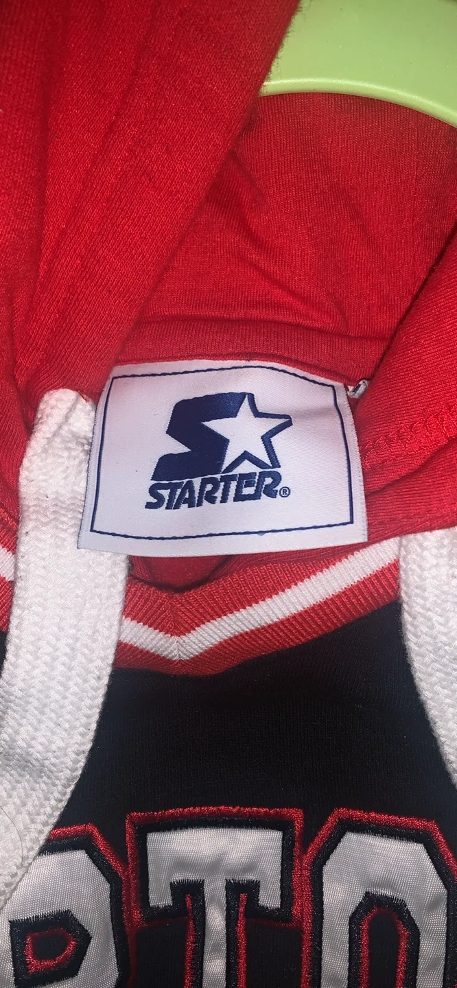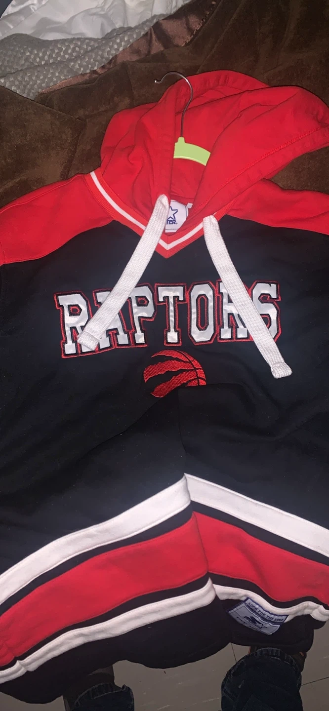 Starter hoodie featuring the Toronto Raptors logo. It's red and black with white accents and drawstrings. This pullover has the team name across the chest and the conference logo on the sleeve. Size large men’s. Bathurst and Dundas.