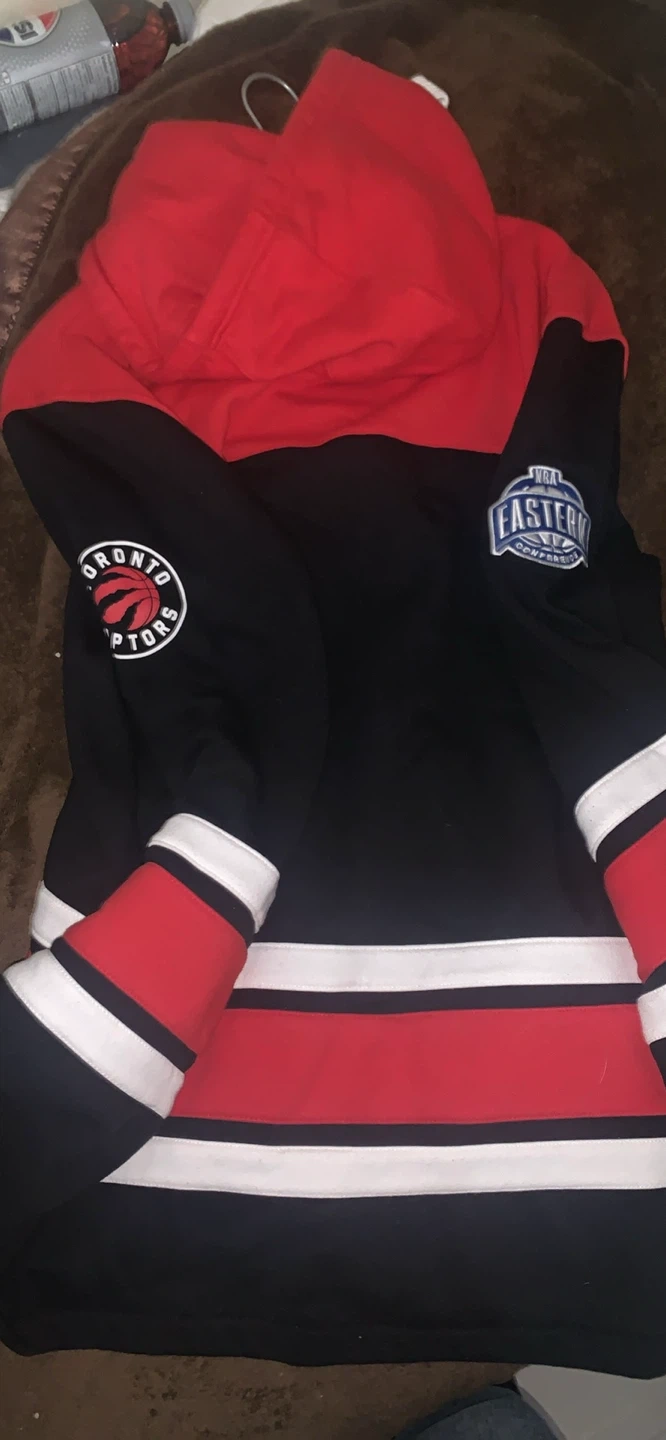 Starter hoodie featuring the Toronto Raptors logo. It's red and black with white accents and drawstrings. This pullover has the team name across the chest and the conference logo on the sleeve. Size large men’s. Bathurst and Dundas.