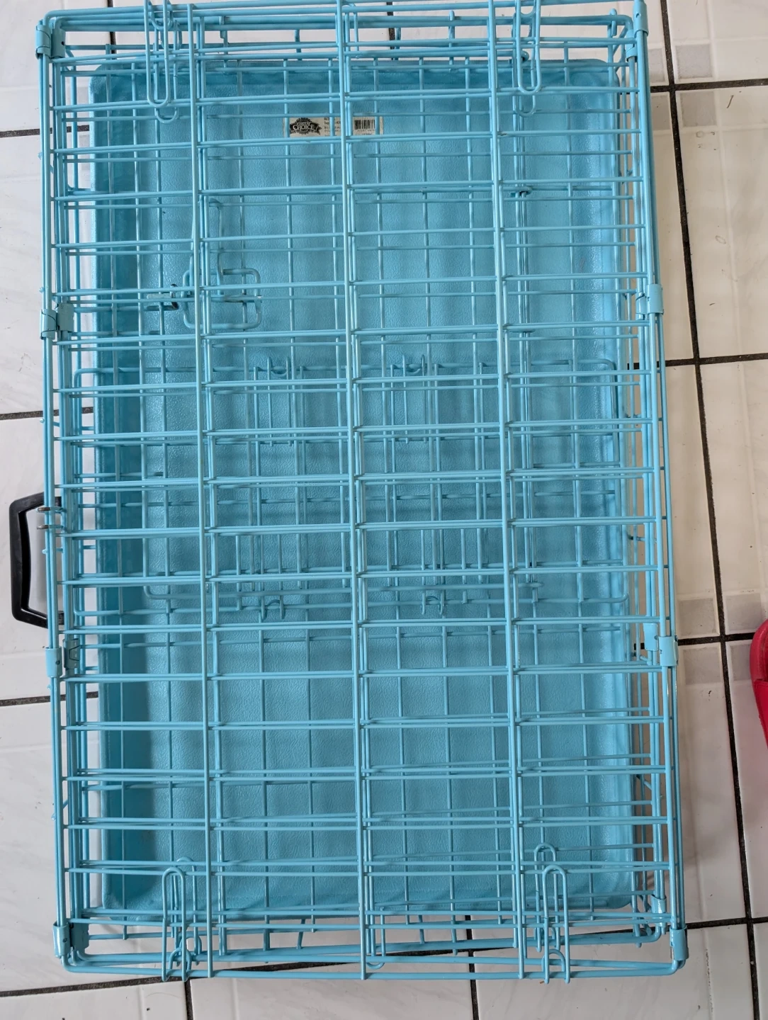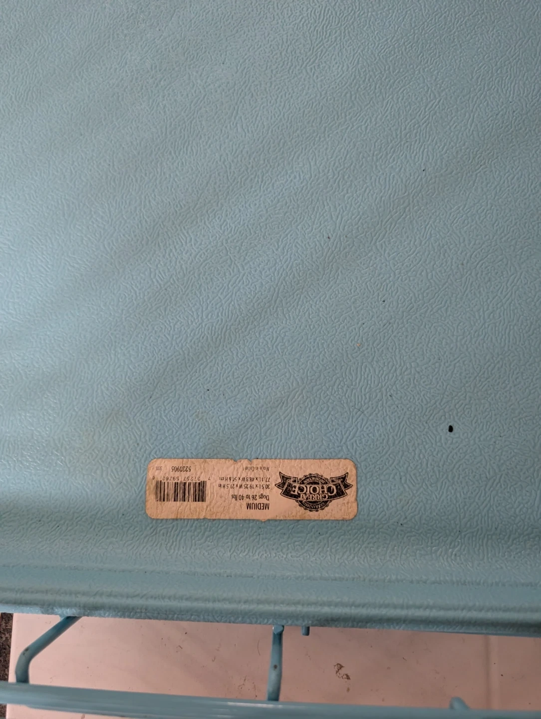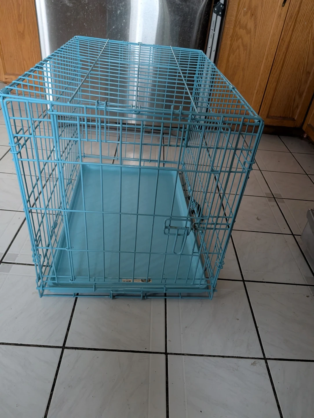 This is a medium-sized metal dog crate from Great Choice. It's blue and includes a plastic tray. Designed for dogs 26 to 40 lbs. It's portable and can be put closed away when not in use. It features a handle for easy transportation.