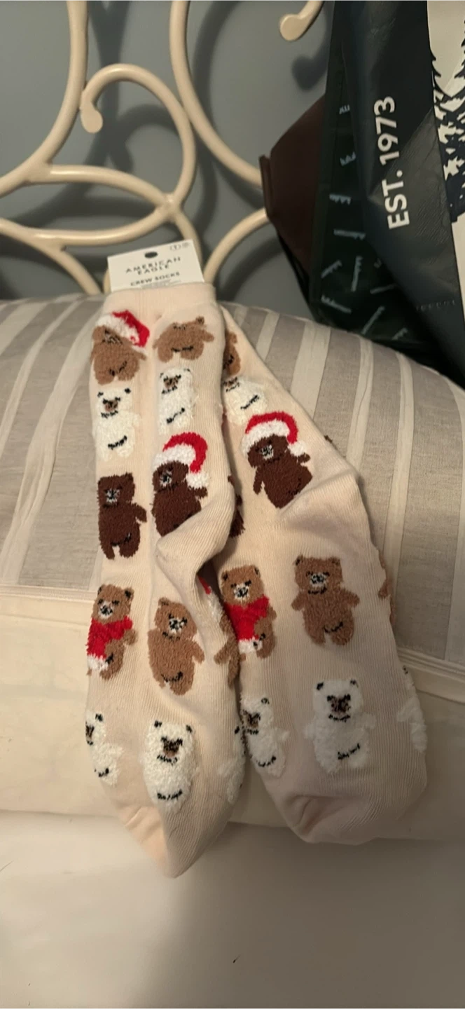 These cute crew socks feature a festive pattern with teddy bears, some wearing Santa hats. They're made by American Eagle. Perfect for cozying up during the holidays!