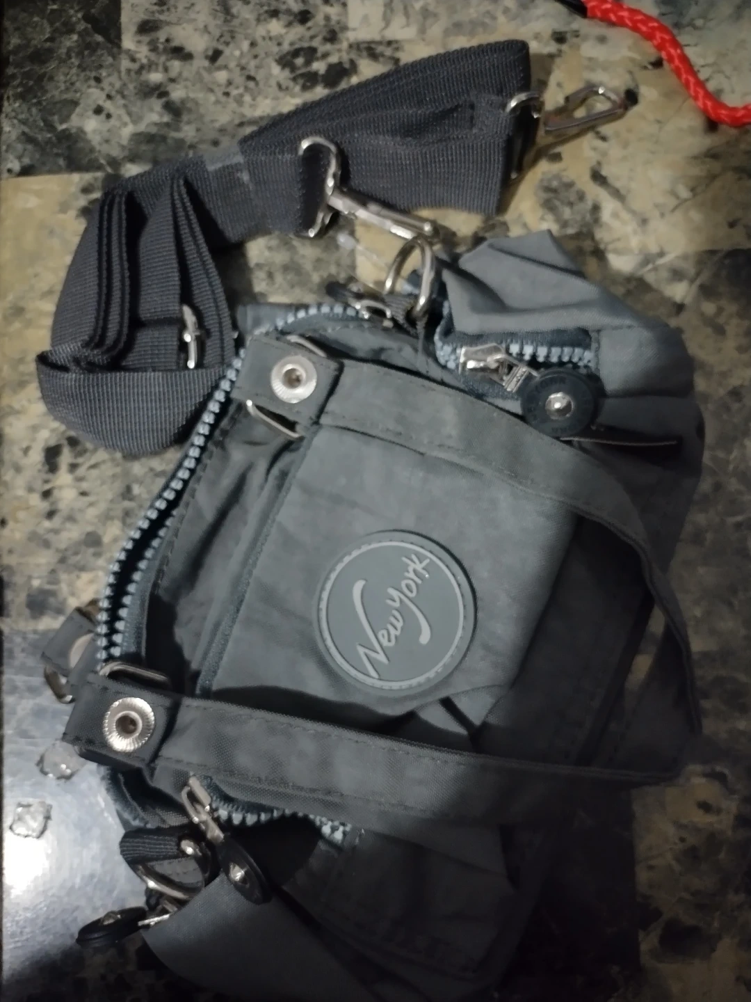 Here's a cute New York handbag in a stylish gray color! It features multiple zippers and compartments, perfect for keeping your belongings organized. The bag also comes with a convenient shoulder strap for easy carrying. It's a great accessory for any outfit!
