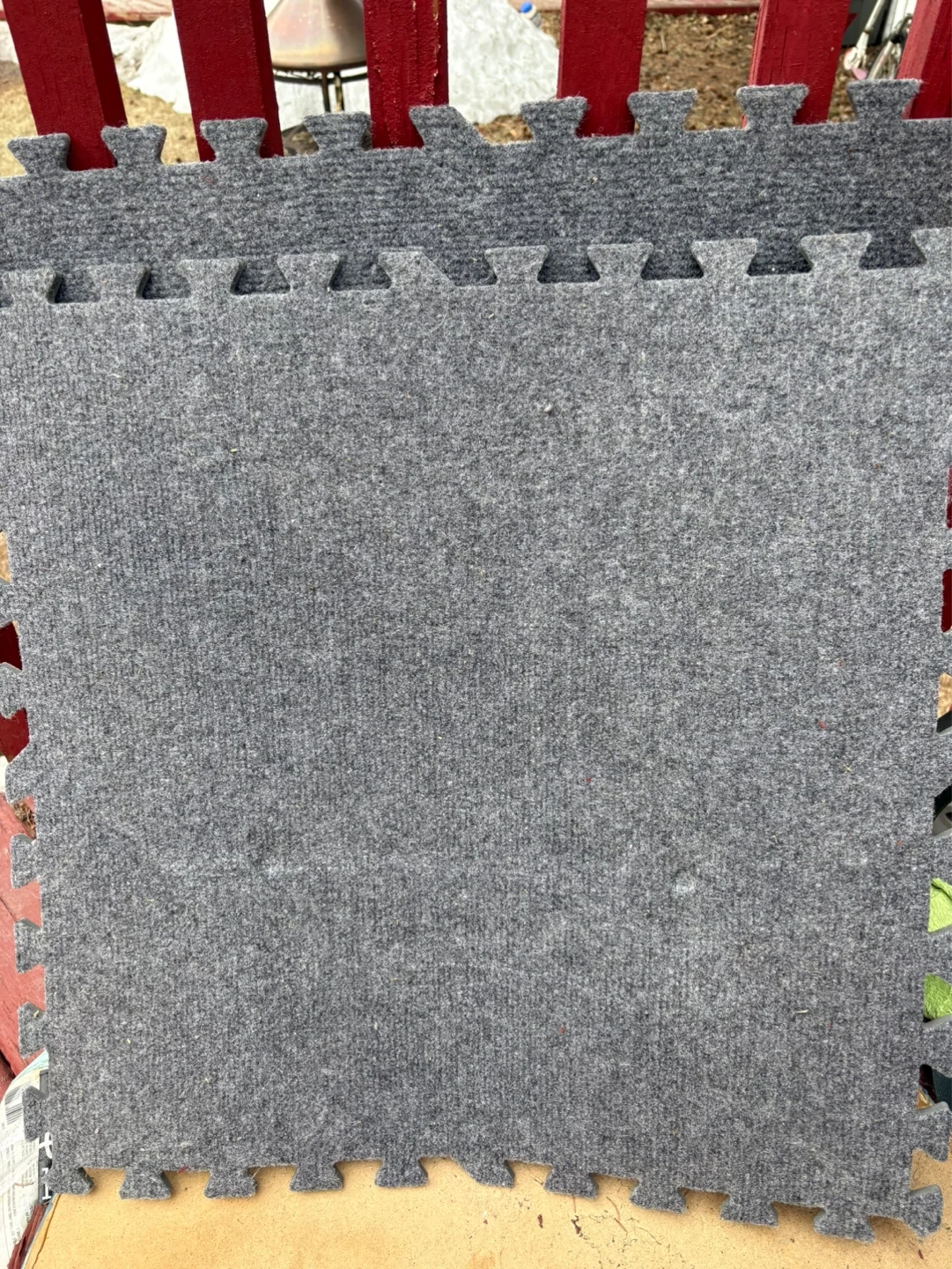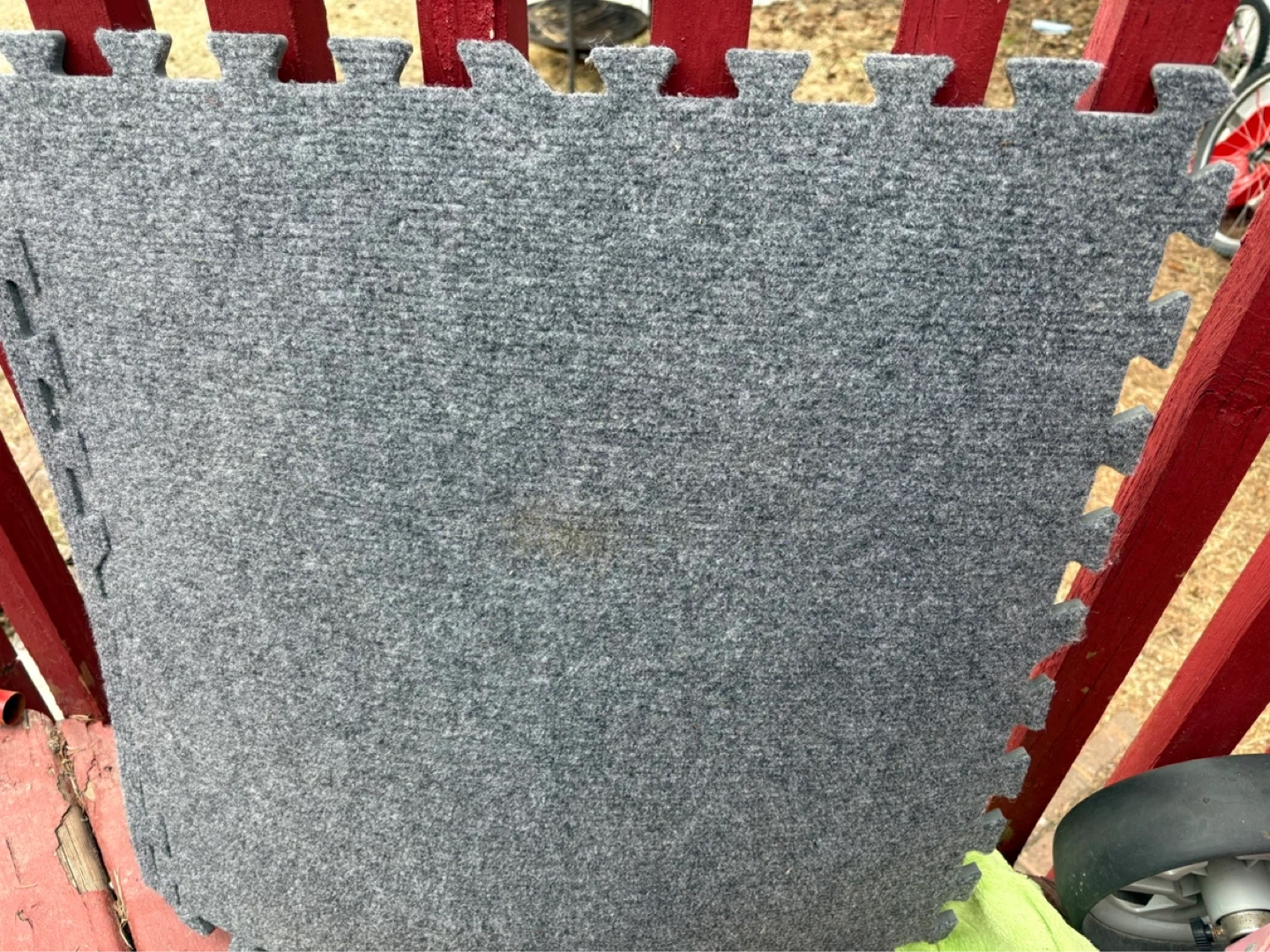 Set of grey interlocking foam floor mats with a carpeted top. They're great for a home gym or play area. Each mat measures approximately 24" x 24".