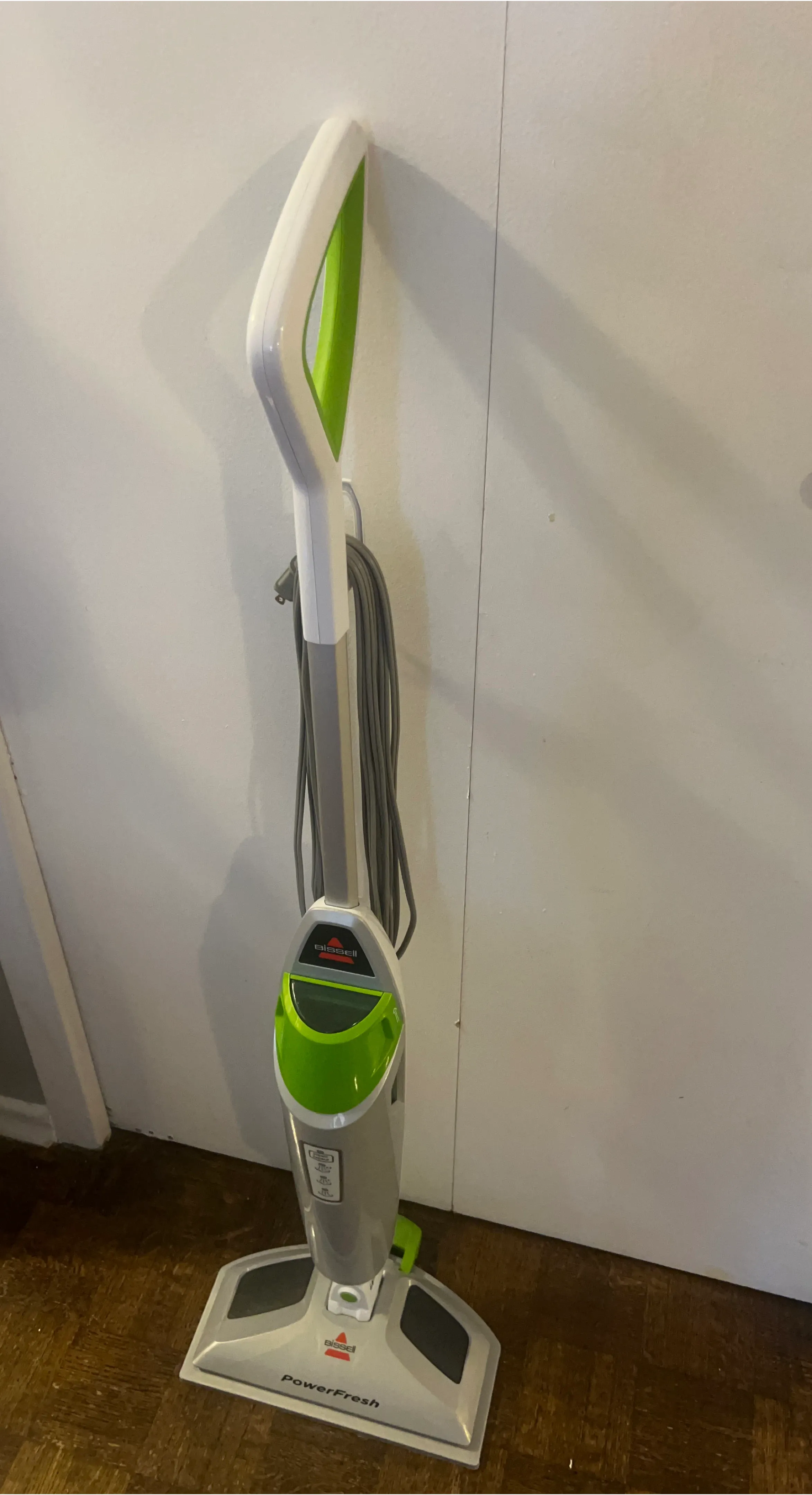 This is a Bissell PowerFresh steam mop. It's great for cleaning hard floors with steam. It has a cord for power. Does not include the cloth mop heads - those would need to be purchased elsewhere.