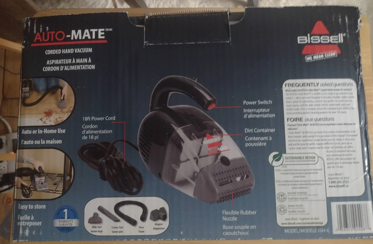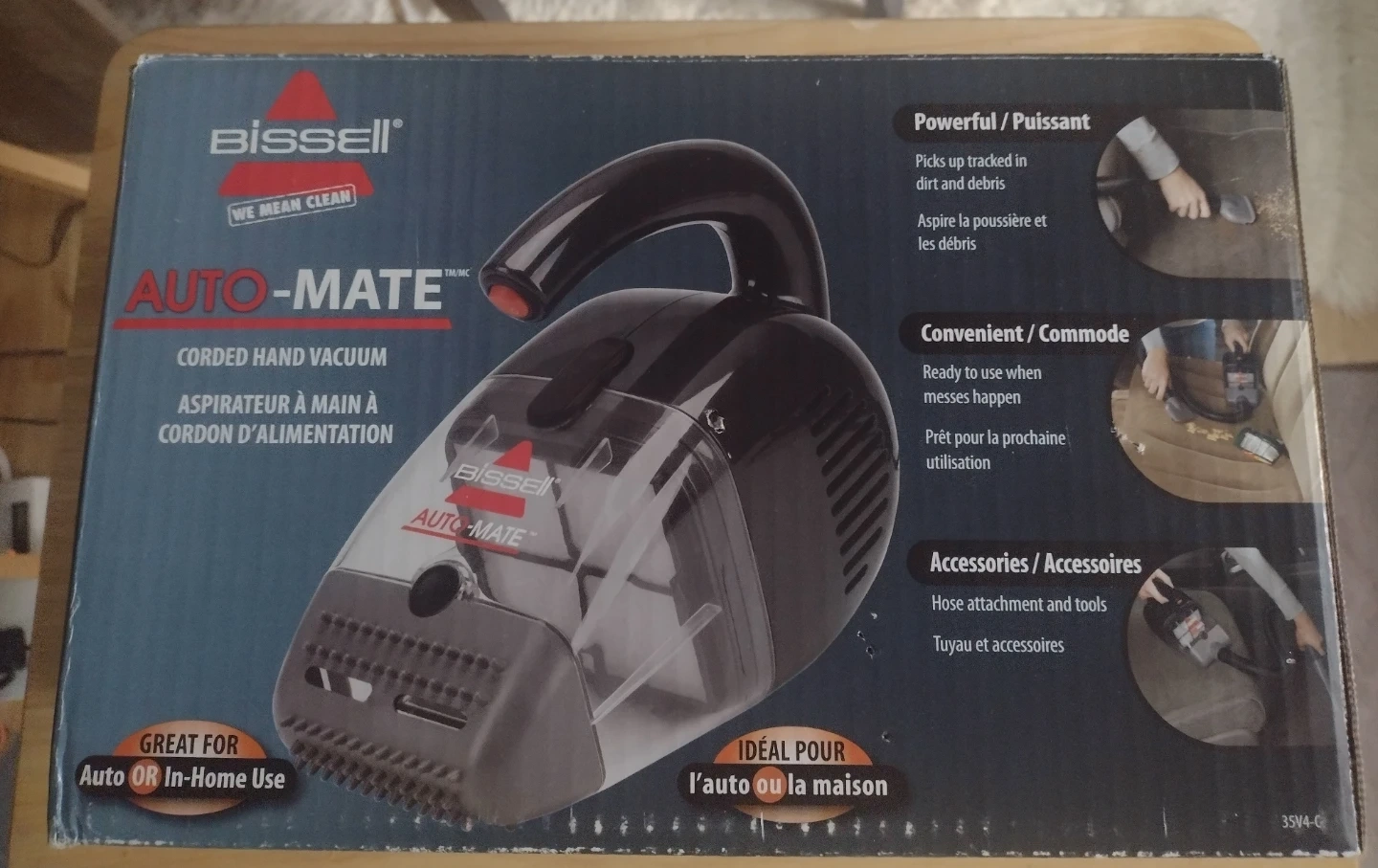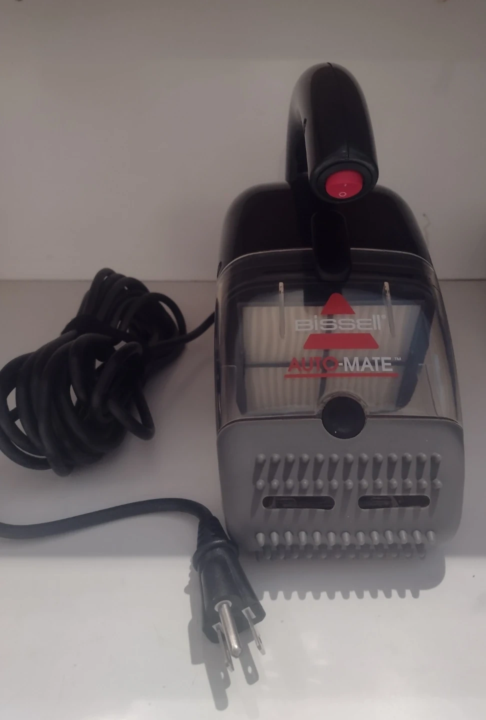 BISSELL Auto-Mate corded hand vacuum for quick cleanups. It comes with a 18ft power cord, flexible rubber nozzle, crevice tool, hose, and adapter. Perfect for tight spaces and quick spills! Brand new as it has never been used.