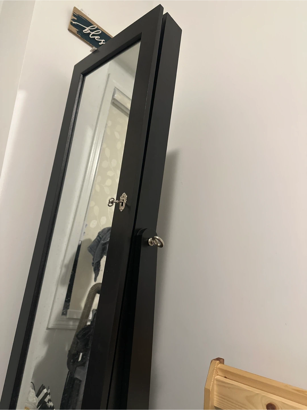 This is a full-length standing mirror with a black frame. It's designed to also function as a jewelry armoire. It opens to reveal storage for your accessories.