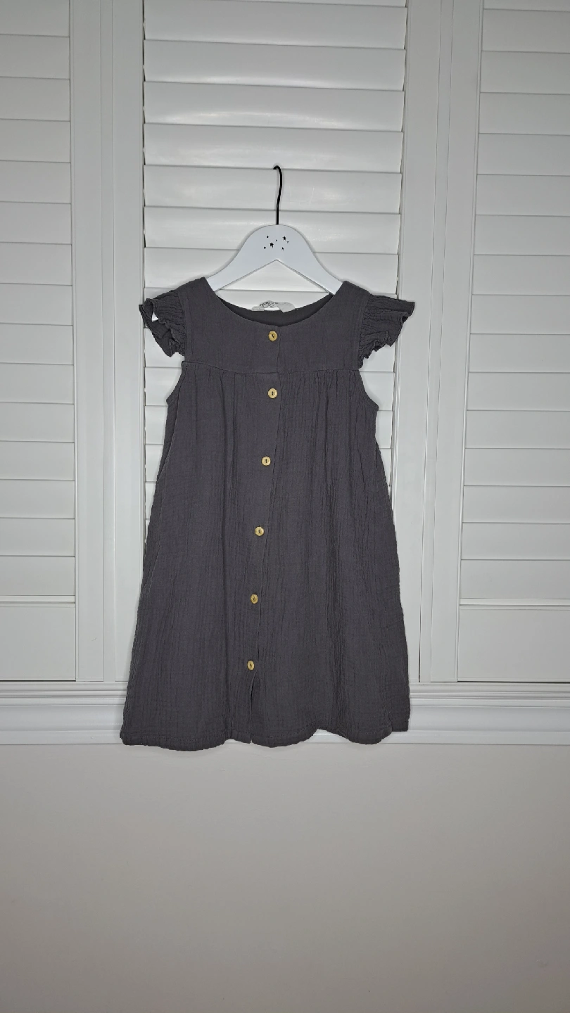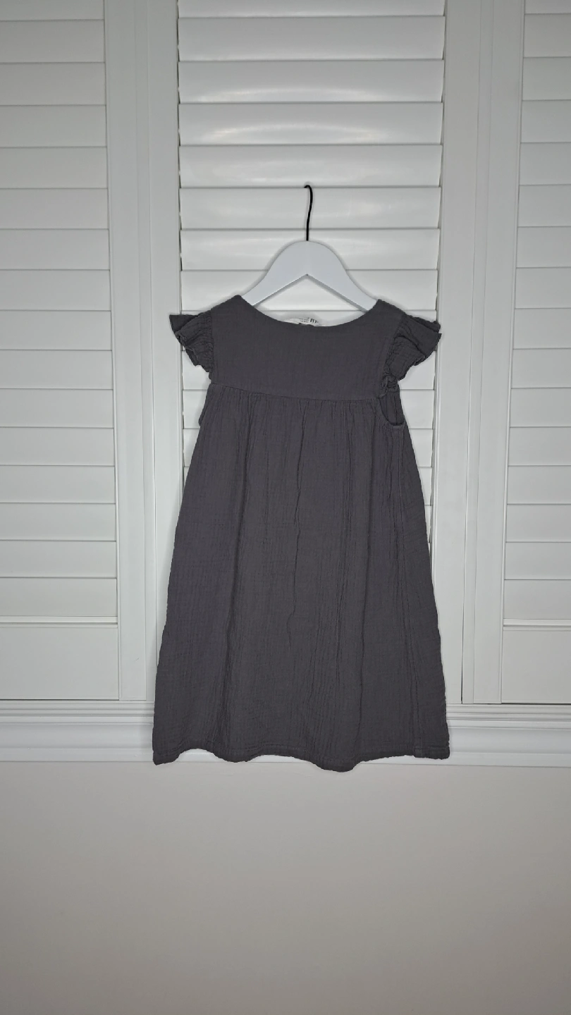 A cute grey dress from H&M in size 6! It features a button-down front and flutter sleeves. Perfect for your little one!
