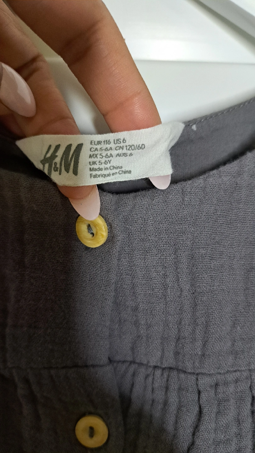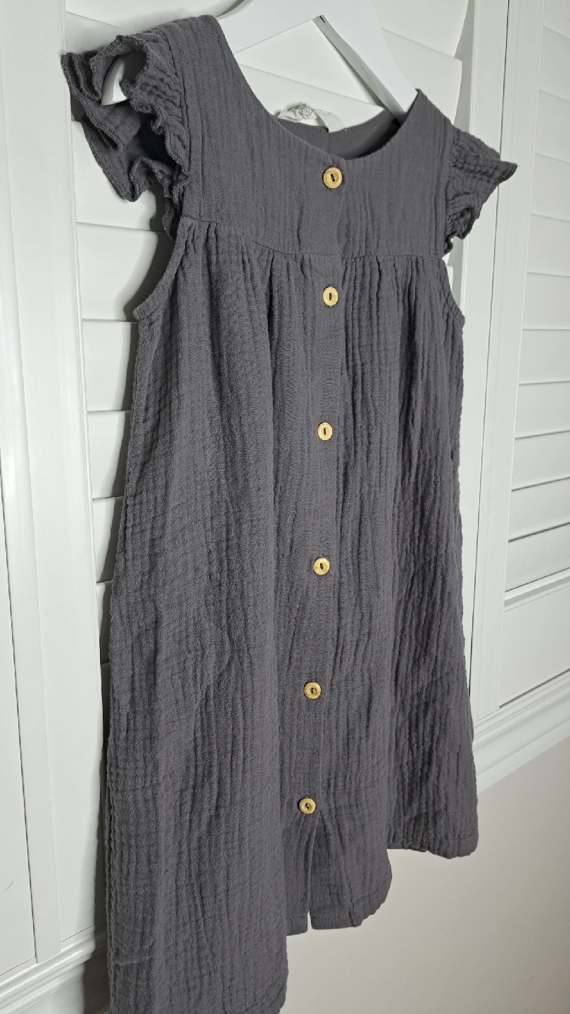 A cute grey dress from H&M in size 6! It features a button-down front and flutter sleeves. Perfect for your little one!
