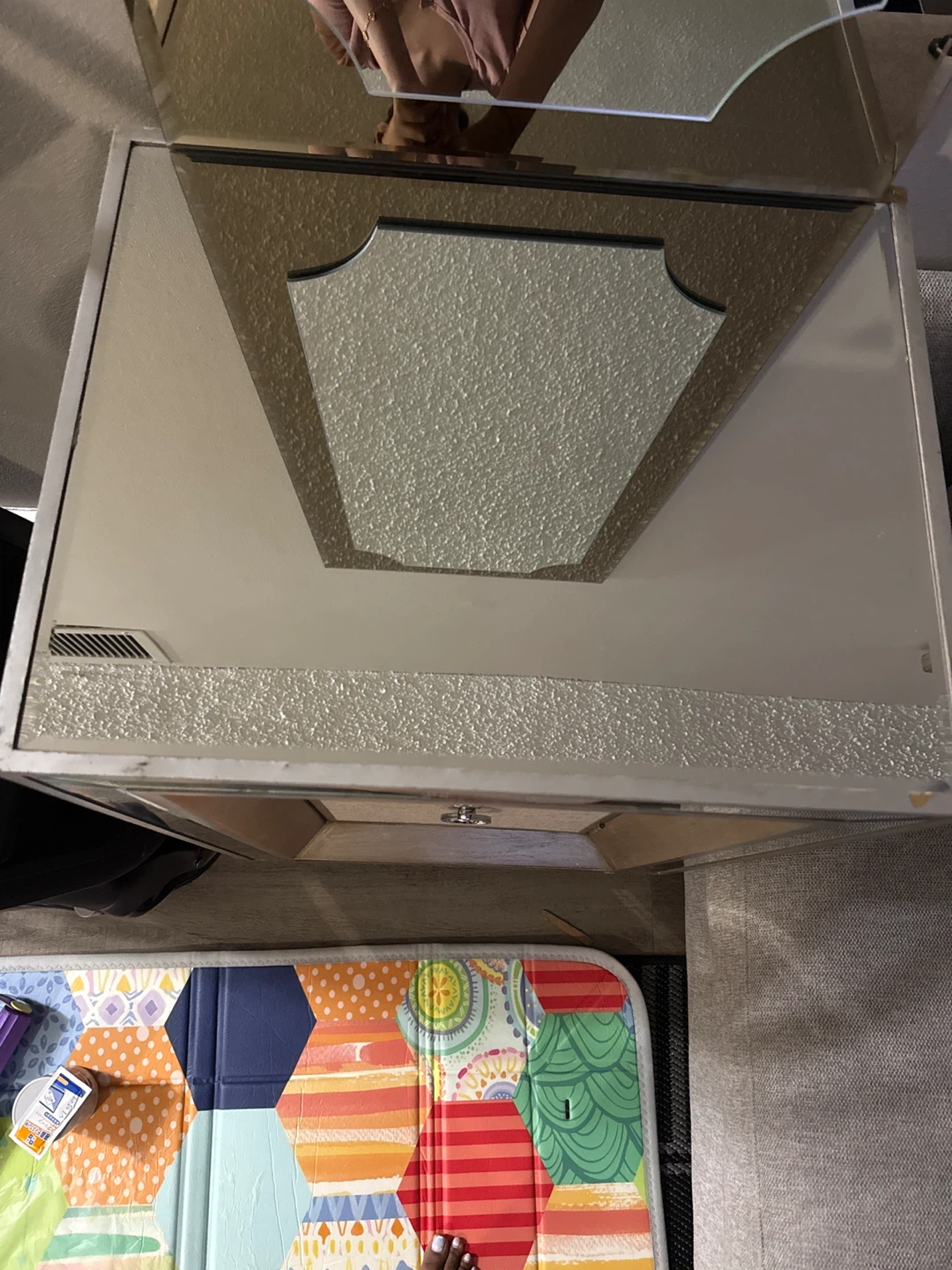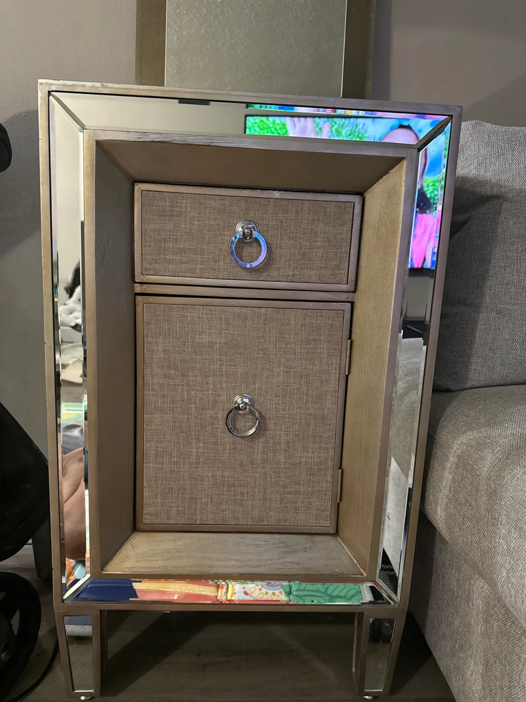 Wooden nightstand two drawers in used condition with minor cracks. Comes with a brand-new mirror that is not attached, just placed on top. Can be used together or separately. Perfect for bedroom or living room decor. See photos for details.”