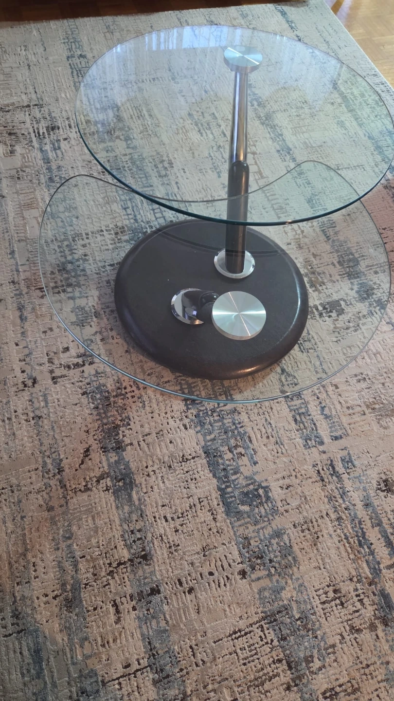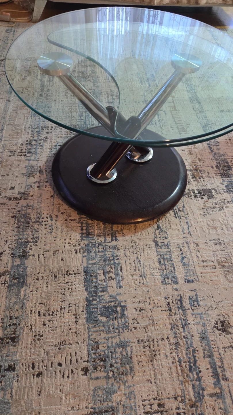 Selling a stylish glass coffee table with a dark brown metal base. It features a unique two-tiered design, perfect for adding a modern touch to your living room. The table is in good condition and ready for a new home! Pet and smoke free home.