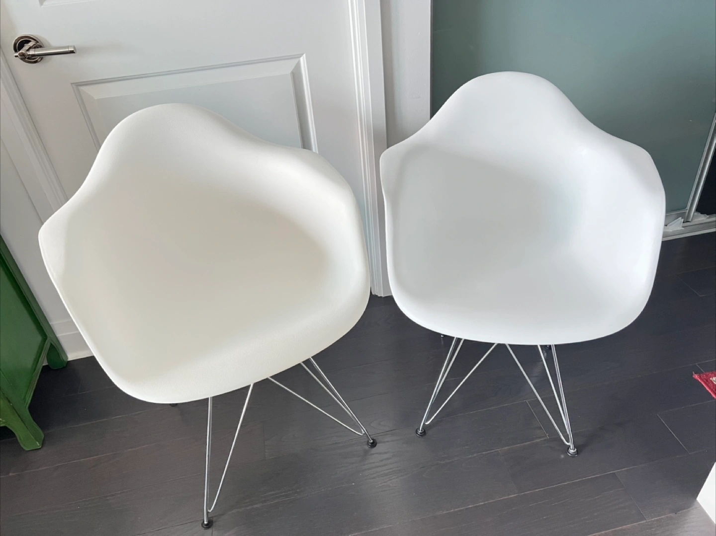 Two white plastic armchairs. Sleek chrome legs. Modern design. Good condition.