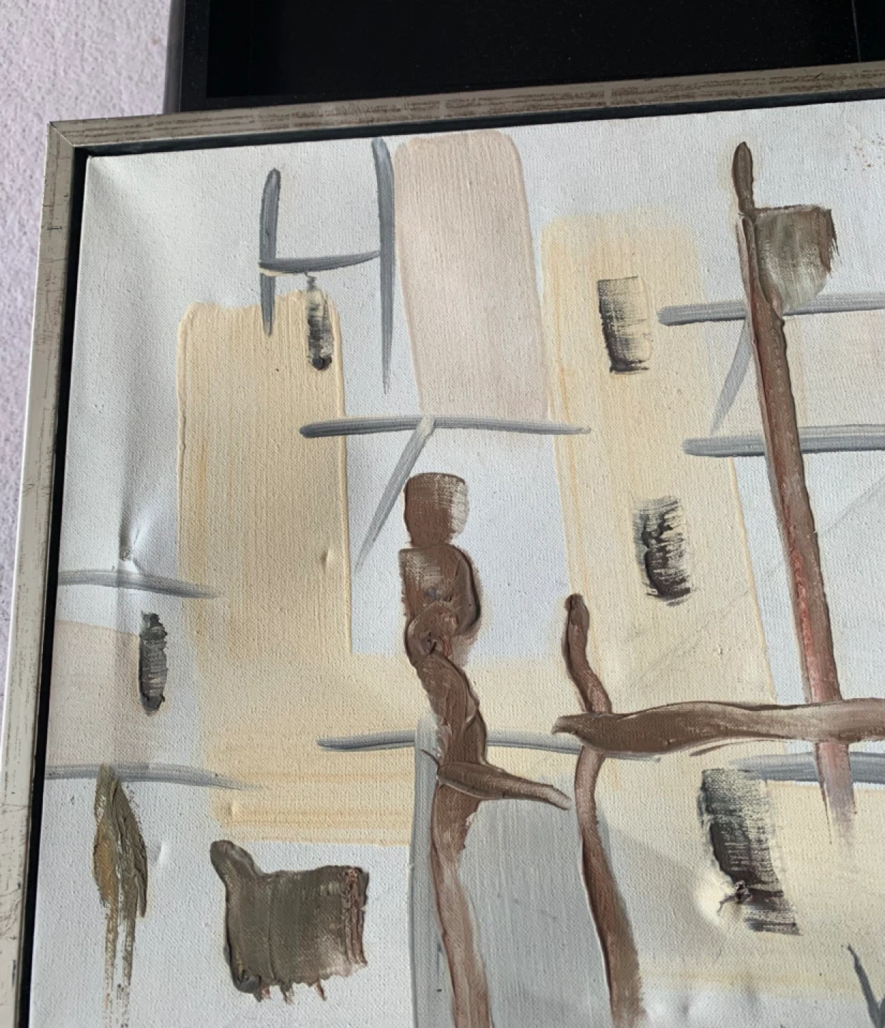 This is a set of two framed abstract paintings depicting cityscapes. They're in neutral tones of beige, grey, and brown. Each canvas is stretched and framed with a silver-toned border. These would add a touch of modern art to any room!
