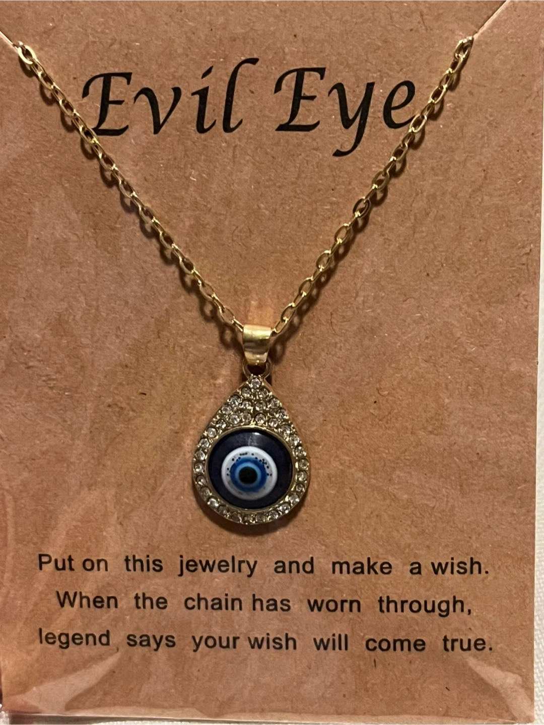 A gold-toned pendant necklace featuring an Evil Eye design. The pendant is teardrop-shaped and surrounded by small, clear stones. It's designed to be worn as a protective charm.