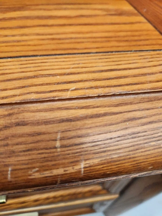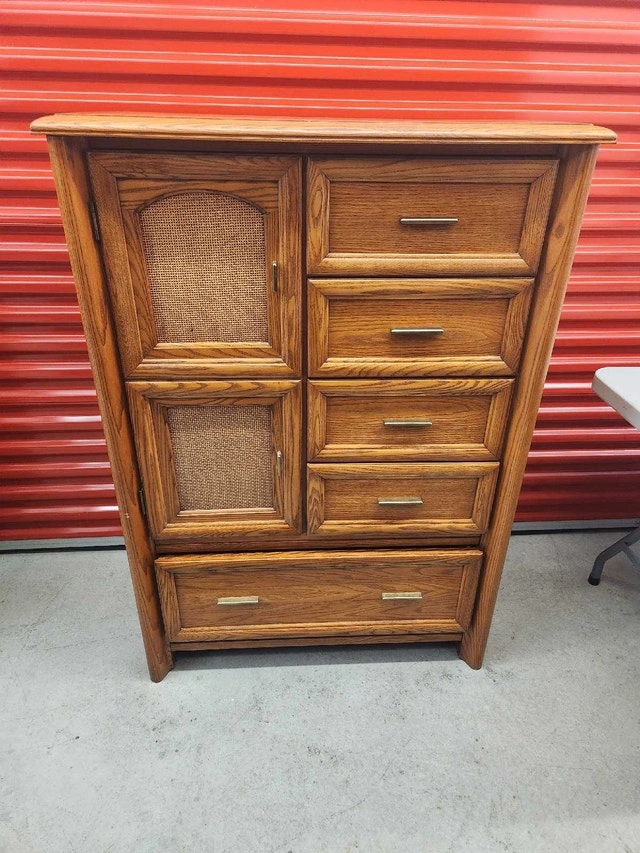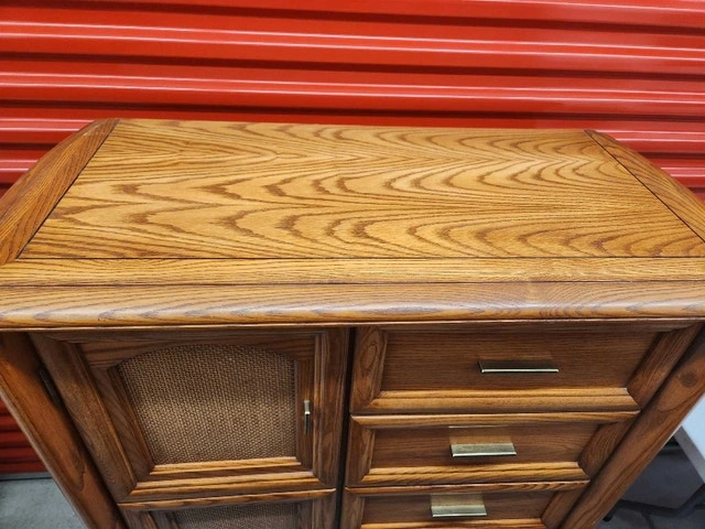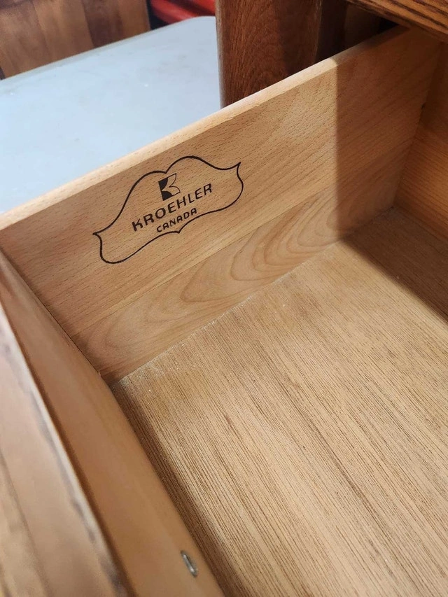 This Kroehler dresser has a classic wood finish and offers plenty of storage with its drawers and cabinet space. It's a lovely piece to add vintage charm to a bedroom. This is a used item and shows signs of wear, with scratches on the finish. Please see photos for details. If you're seeing this ad, the dresser is still available.