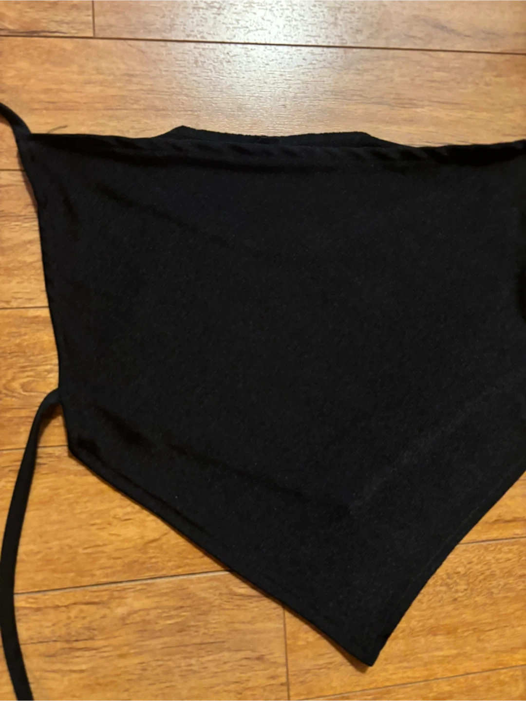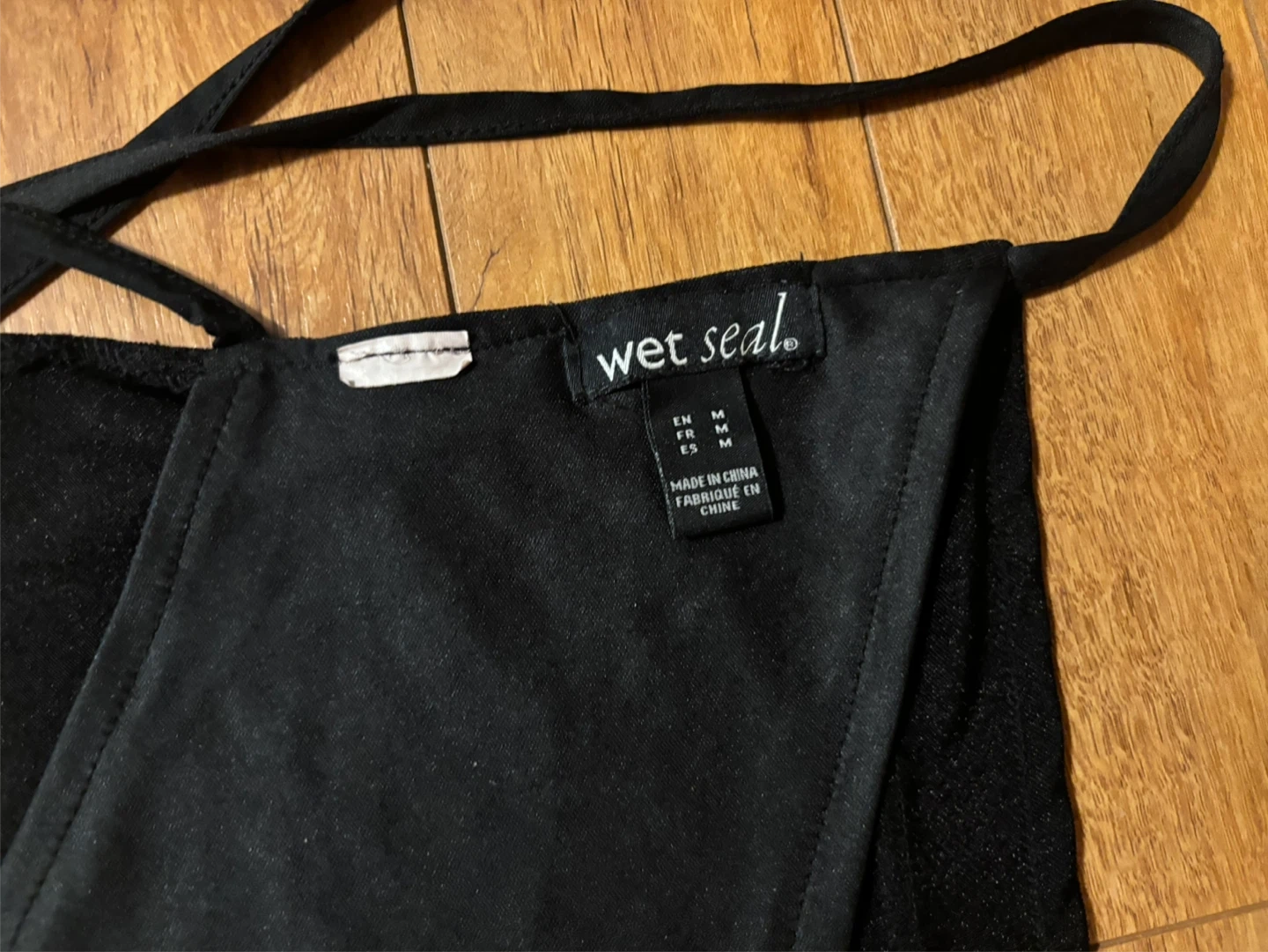 This is a black bandana halter neck top from Wet Seal. It's a size medium with tie closures for an adjustable fit. The material is soft and stretchy for comfort.