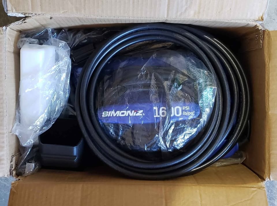 Very rarely used Simoniz 1600 PSI pressure washer with Foam Blaster. Original box available with all components/accessories.