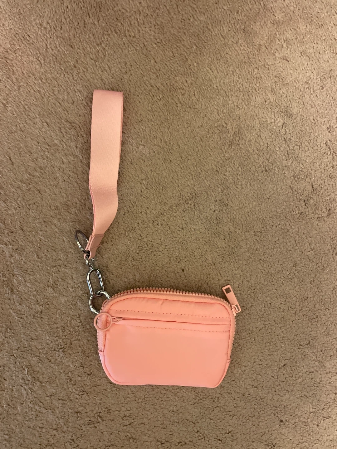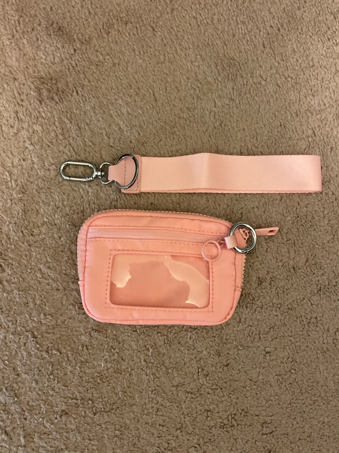 This pink card holder pouch features a clear ID window and multiple card slots inside. It comes with a detachable wrist strap for easy carrying. Zipper closure keeps your essentials secure. It's perfect for organizing cards and small items on the go!