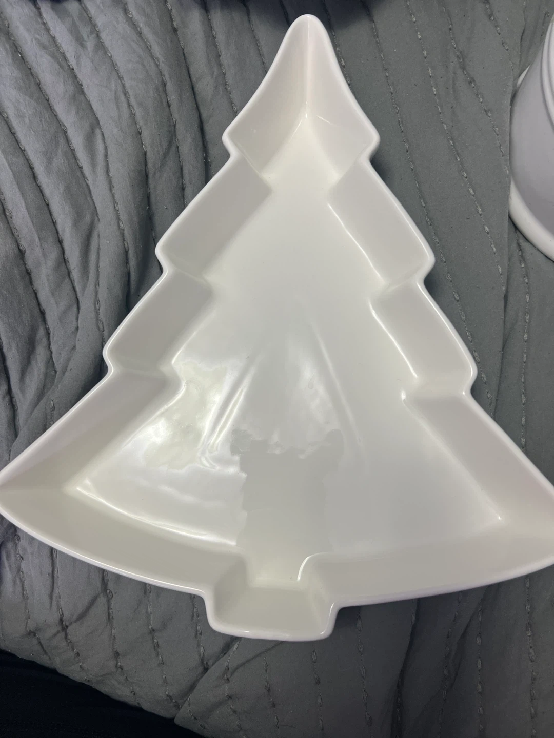 Selling a lovely Chefology pitcher and tree plate set. Both are white and in great condition. The pitcher is dishwasher and microwave safe. Perfect for your holiday gatherings! Both for $10