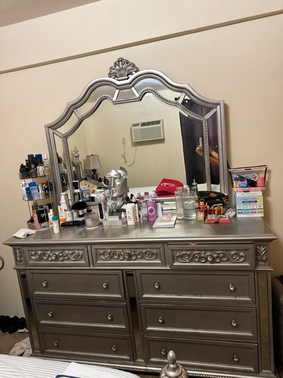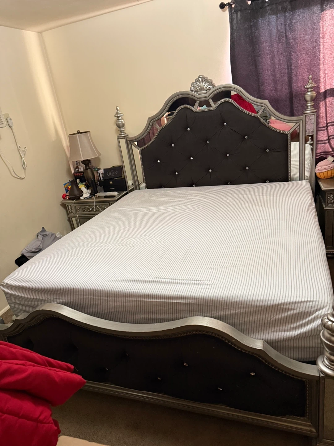 Beautifully designed bed frame with a tufted headboard adorned with crystal-like accents. The frame features elegant mirrored panels and a decorative silver finish. Its ornate detailing adds a touch of luxury to any bedroom. This set includes the bed frame only. 2night Stan