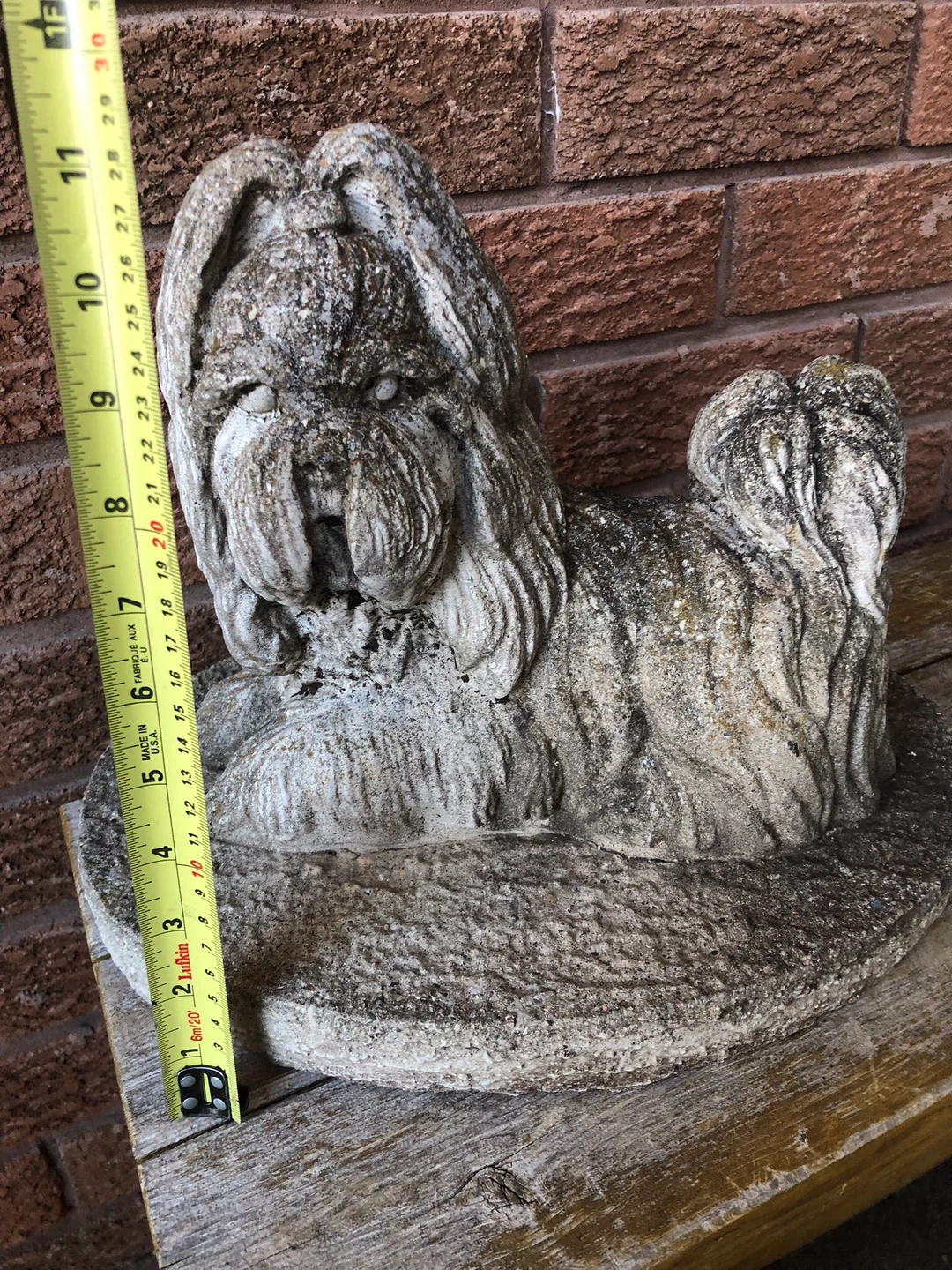 This is a stone statue of a fluffy dog, perfect for your garden or patio. It measures approximately 12 inches tall and 14 inches wide. Adds a charming touch to any outdoor space!