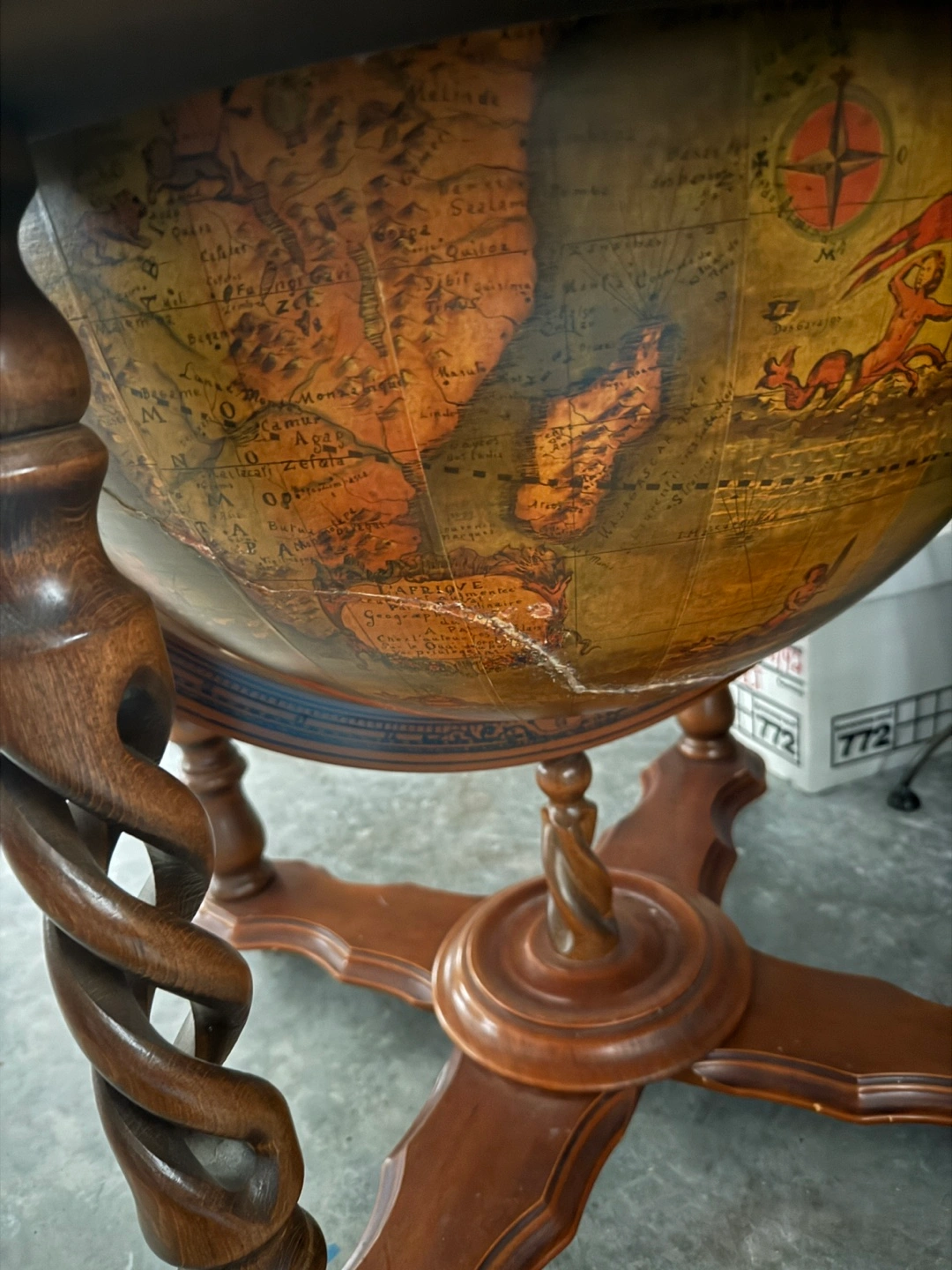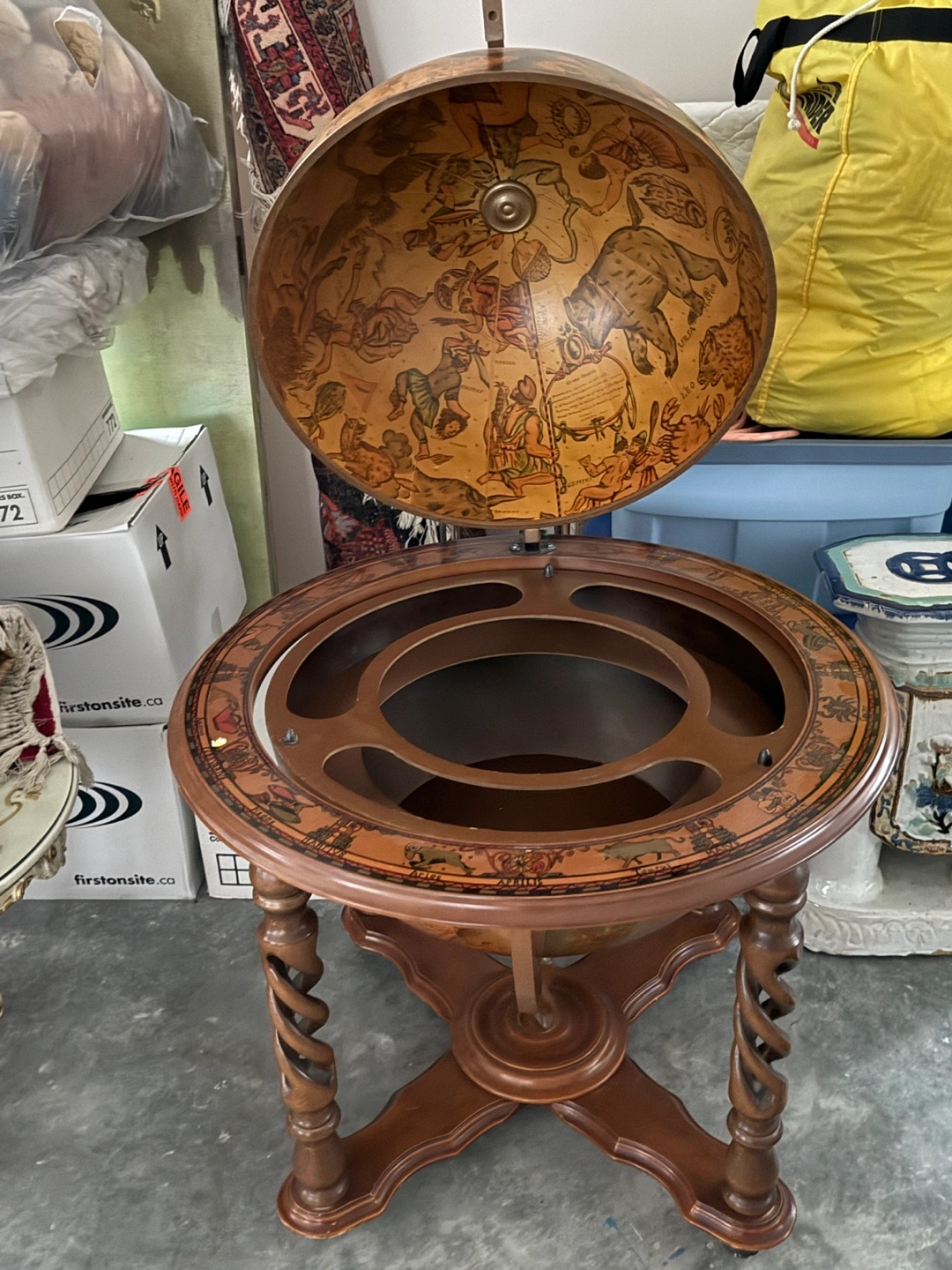 A vintage bar globe stand with a detailed world map. It opens to reveal a storage compartment for glasses & bottles inside. Made of wood with ornate carved details on the stand and legs. It has a mended crack underneath as pictured but you don’t see unless you look under.