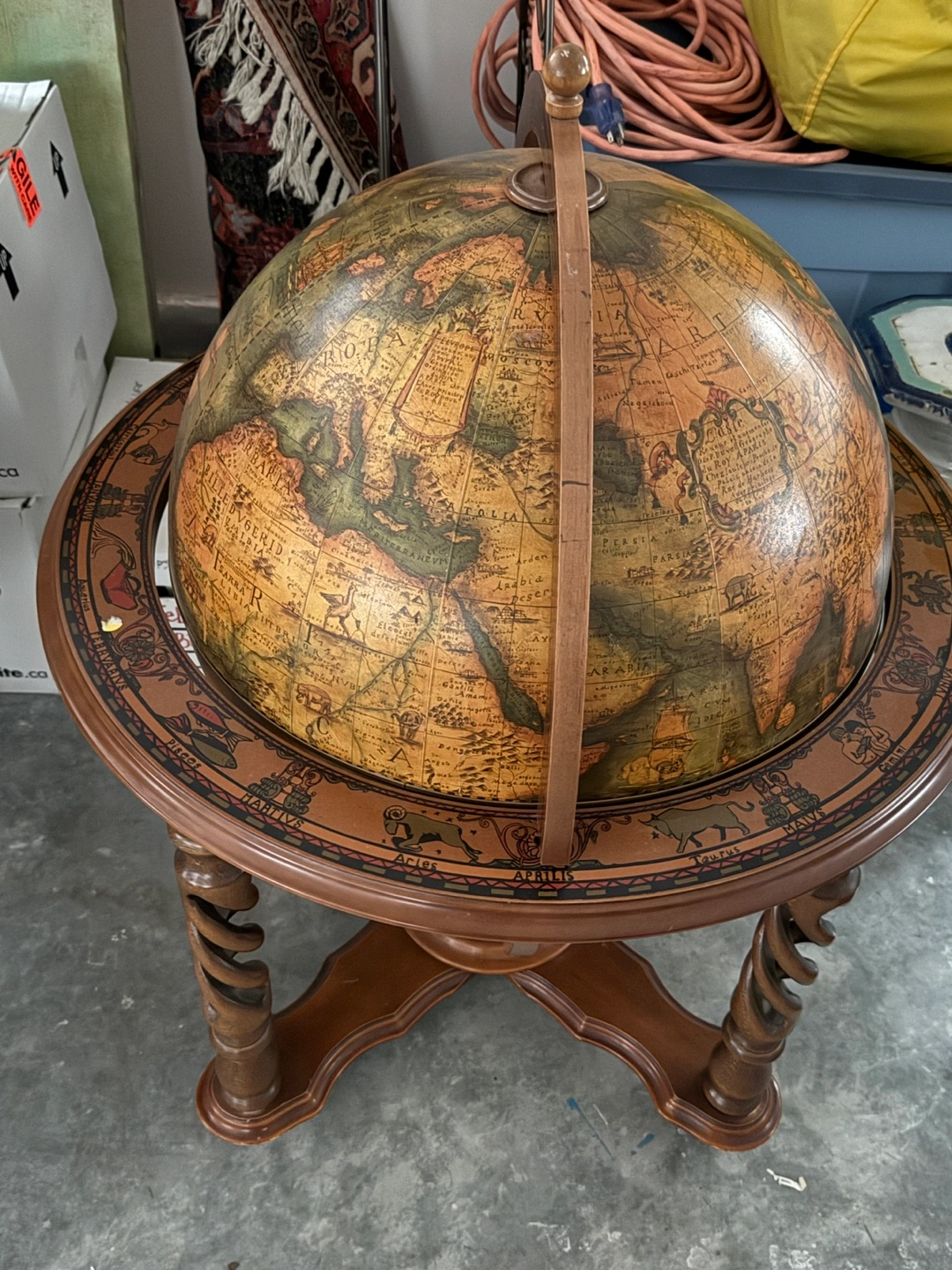 A vintage bar globe stand with a detailed world map. It opens to reveal a storage compartment for glasses & bottles inside. Made of wood with ornate carved details on the stand and legs. It has a mended crack underneath as pictured but you don’t see unless you look under.