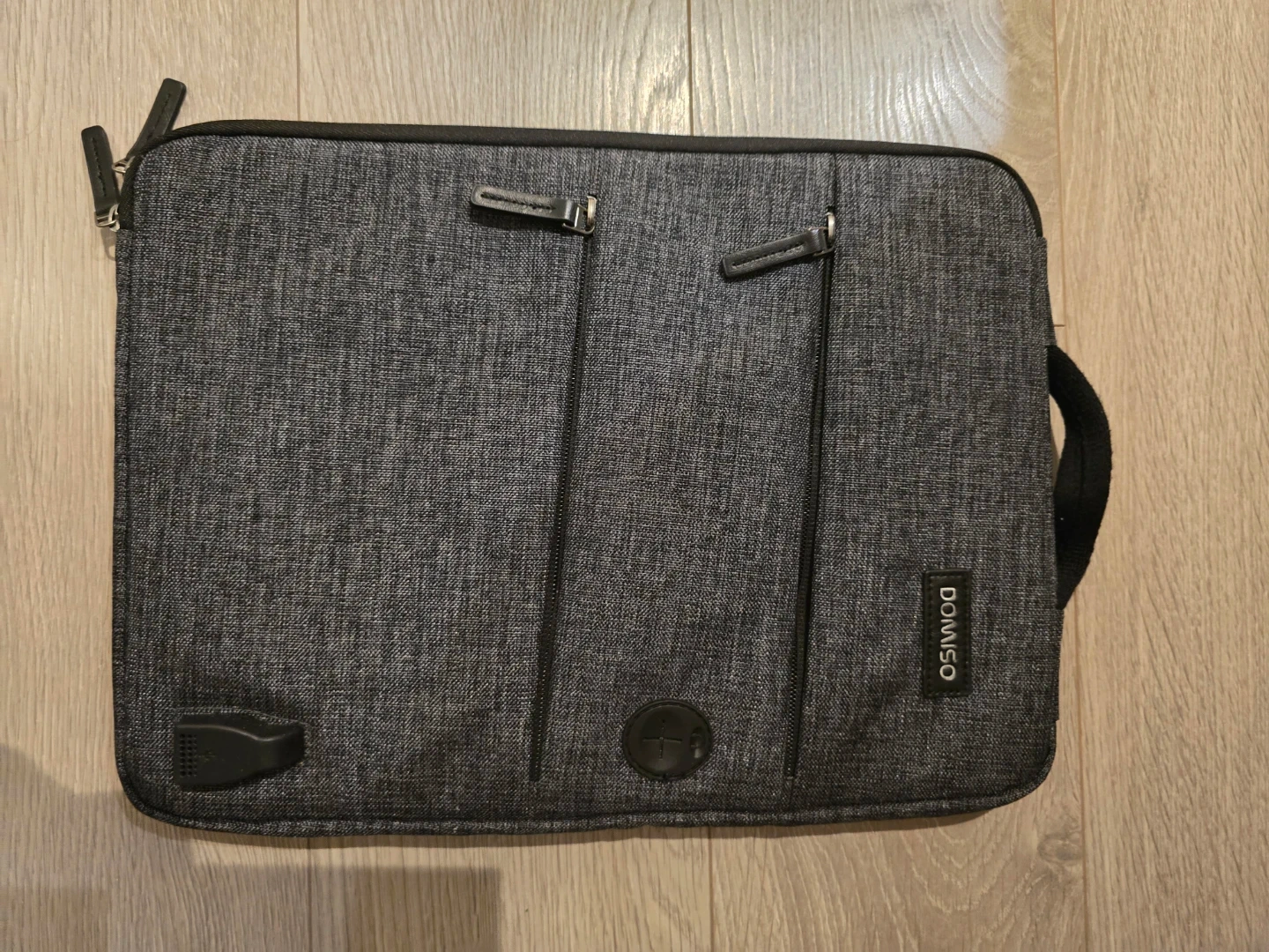 Here's a DOMISO 13.3 inch laptop sleeve in great condition! It has a handle and a USB port on the side. Perfect for protecting your laptop or tablet on the go.