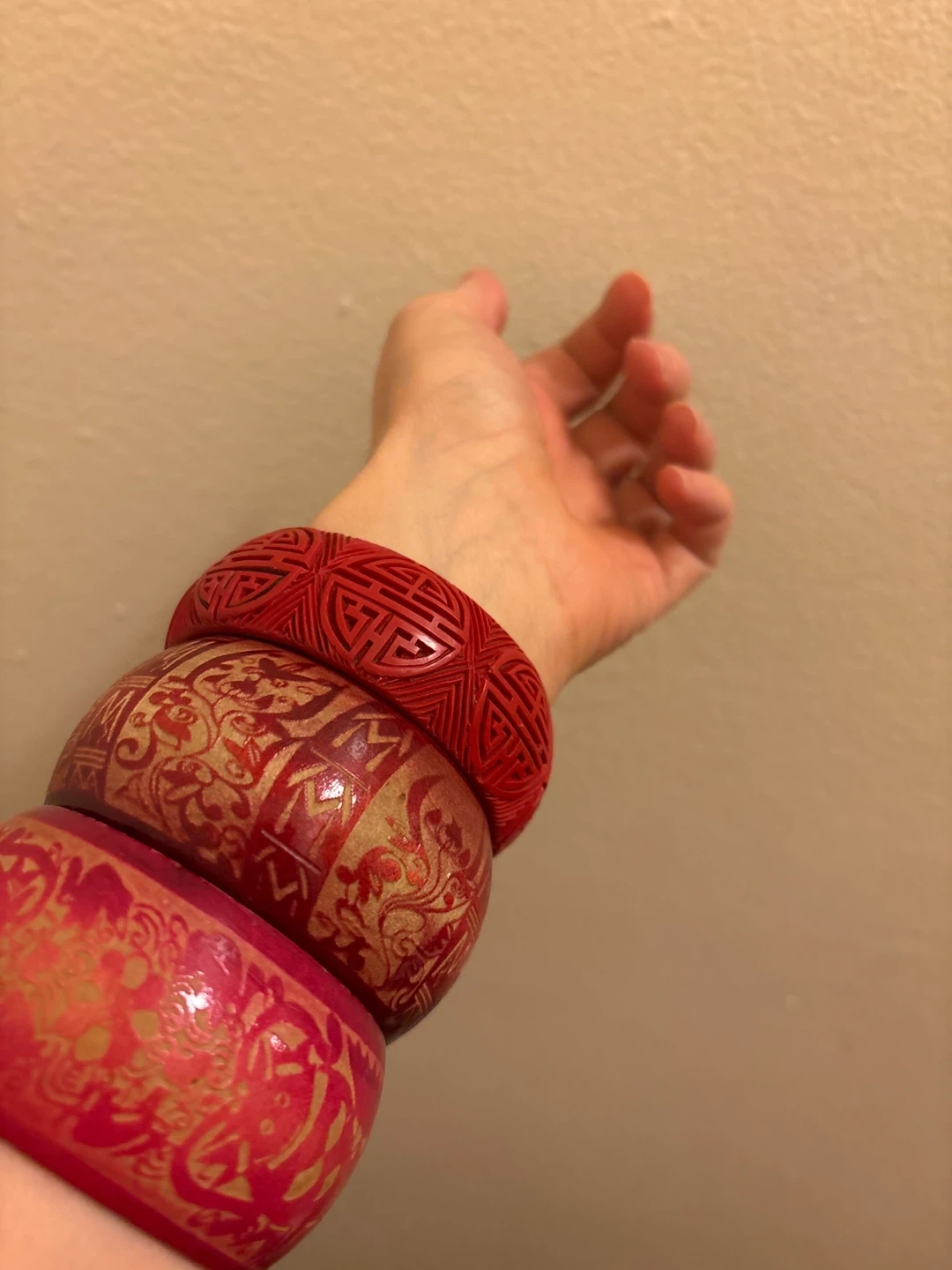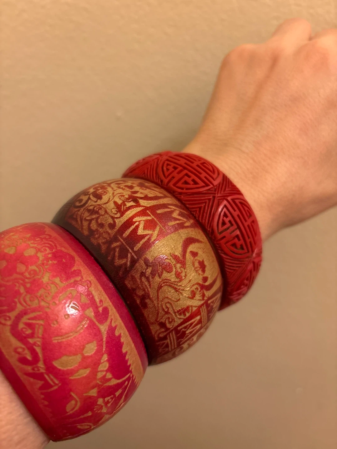 Set of three bangles with intricate designs. Features a red carved bangle, a red and gold patterned bangle, and a bright pink and gold patterned bangle.These statement pieces add a unique touch to any outfit!