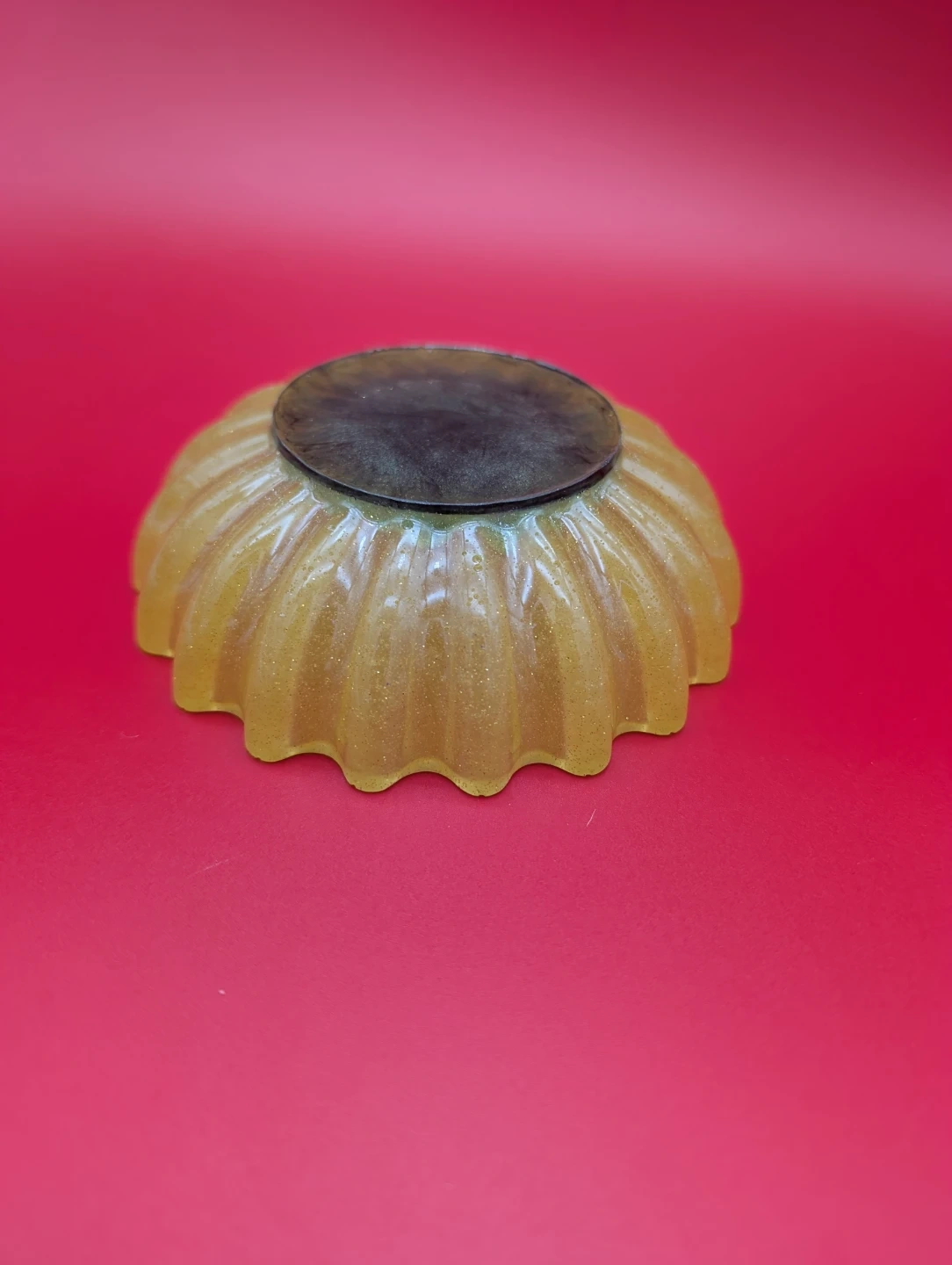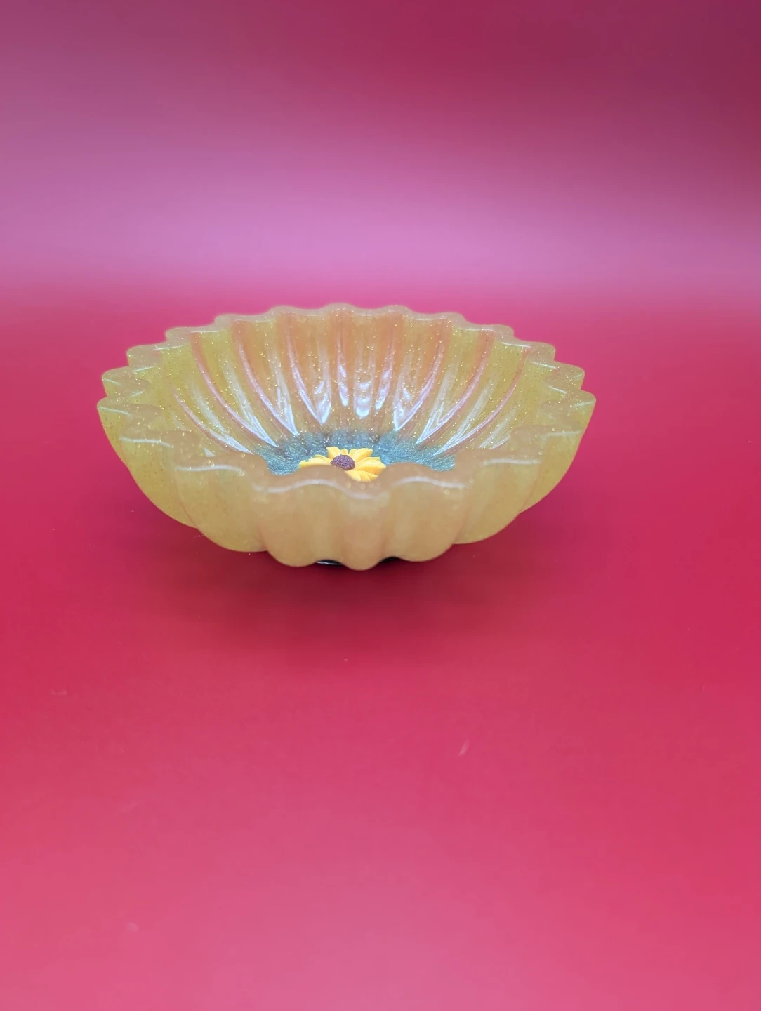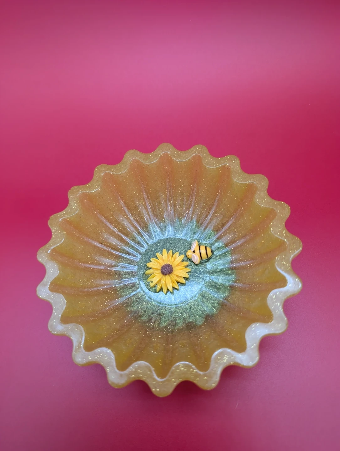This handmade resin bowl features a cheerful sunflower design with a cute bee accent. It's perfect for holding small trinkets or as a decorative piece on a desk or shelf. The bowl has a fluted edge and a glittery yellow finish.