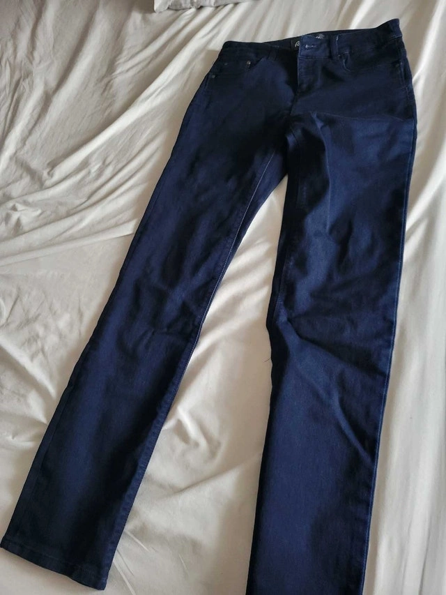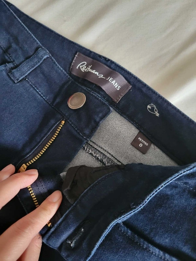 These are Reitmans dark wash denim jeans, a stylish and versatile addition to any wardrobe. They are in used but good condition, showing minimal signs of wear. Key Features: Brand: Reitmans, Size: Petite 0, Wash: Dark Wash. If the ad is up, the jeans are available!