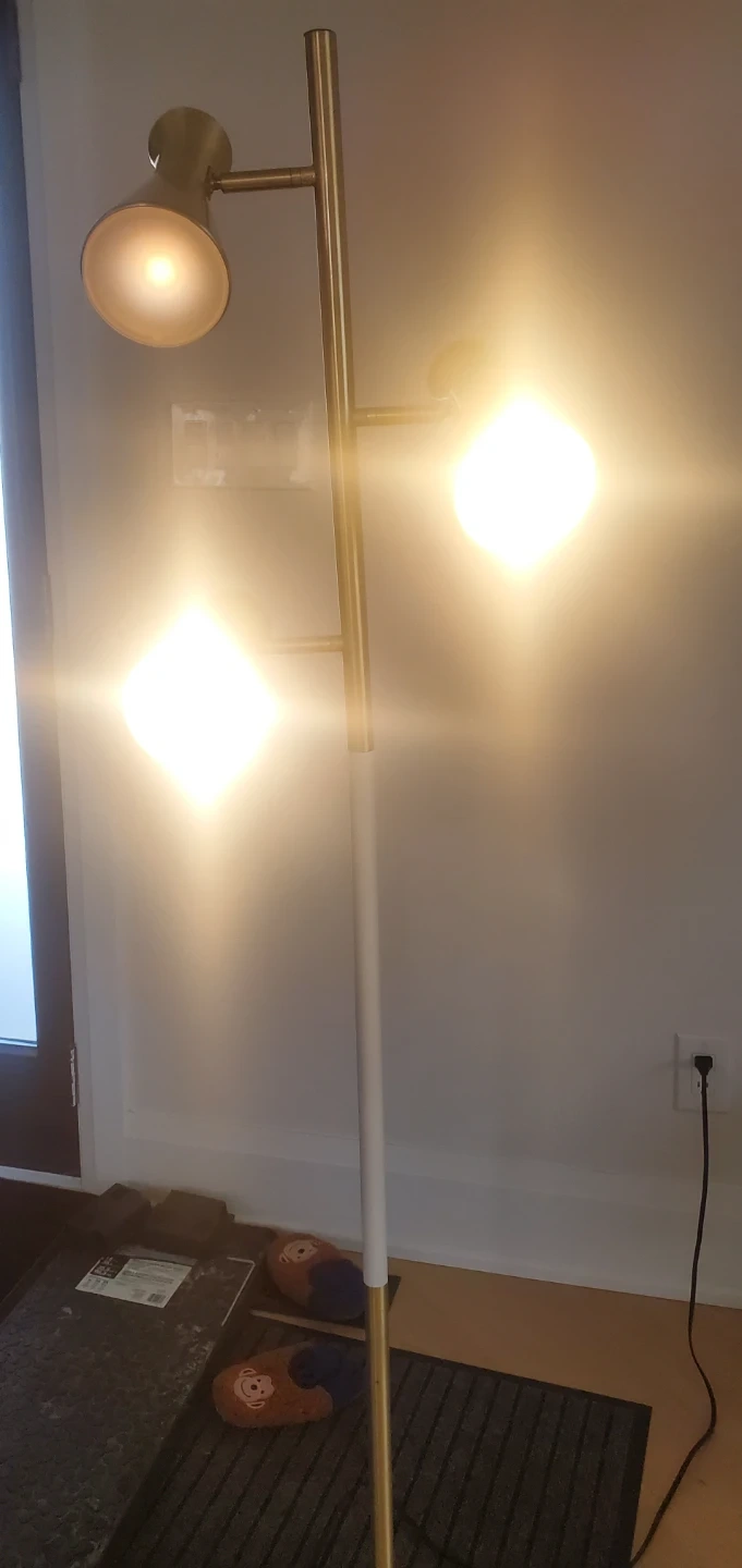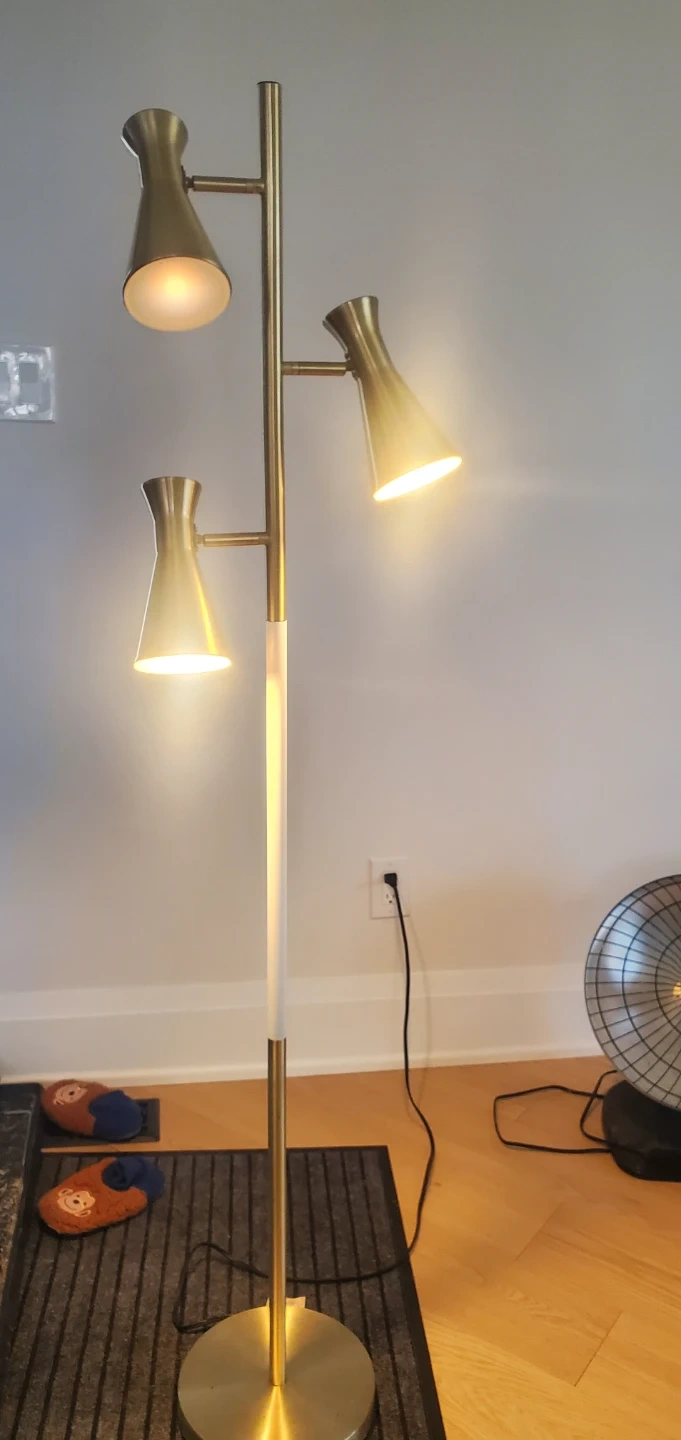 Stylish 5ft multi-head floor lamp with a brushed brass finish and a white accent. It features three adjustable lights, perfect for directing illumination where you need it. This lamp provides ambient or task lighting for any room.