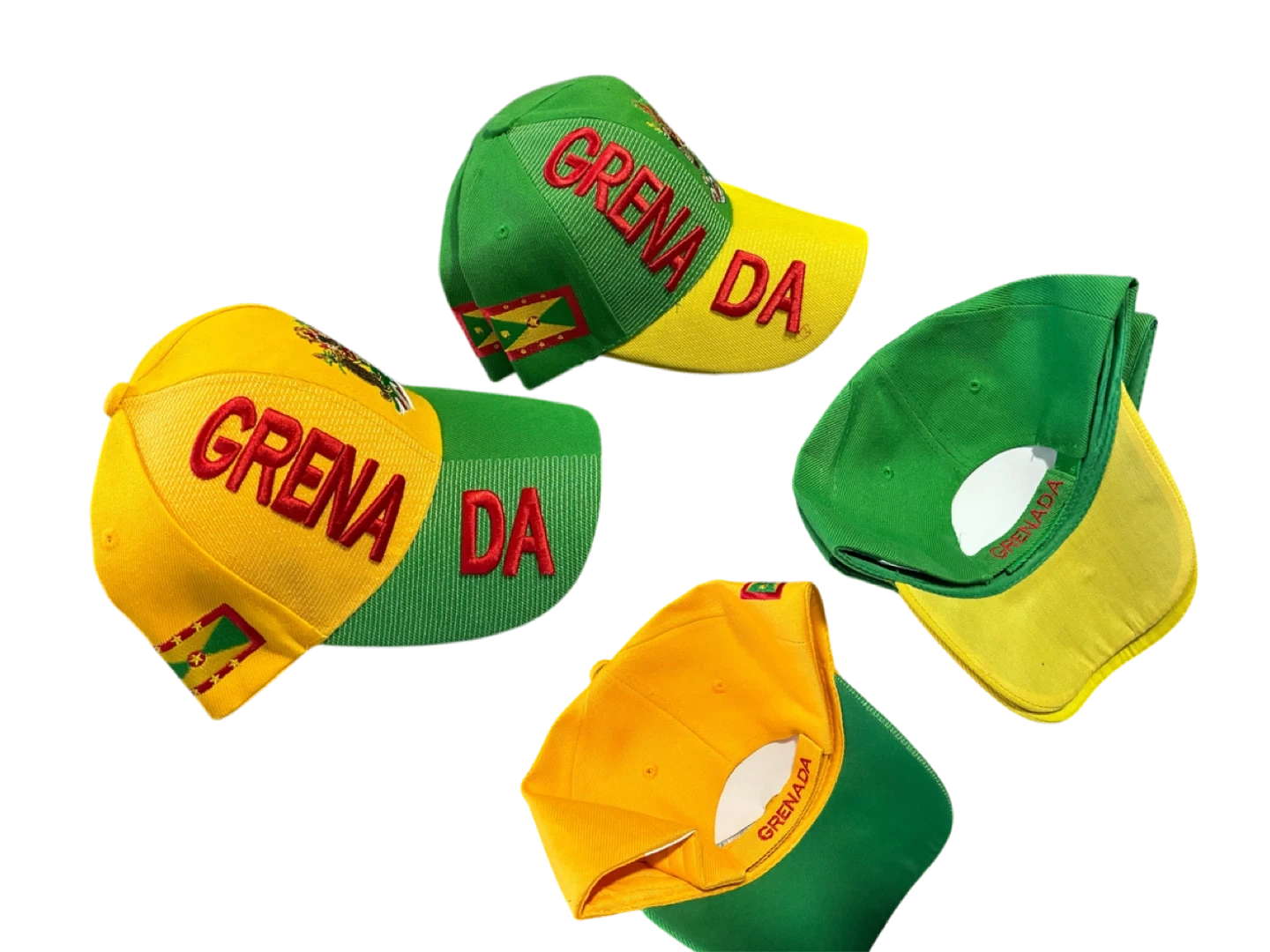 Two baseball caps embroidered with 'Grenada'. These hats feature a yellow and green colour scheme with the Grenadian flag detail on the side. One cap is primarily green with a yellow brim, and the other is yellow with a green brim. They're suitable for showing national pride or as a souvenir!