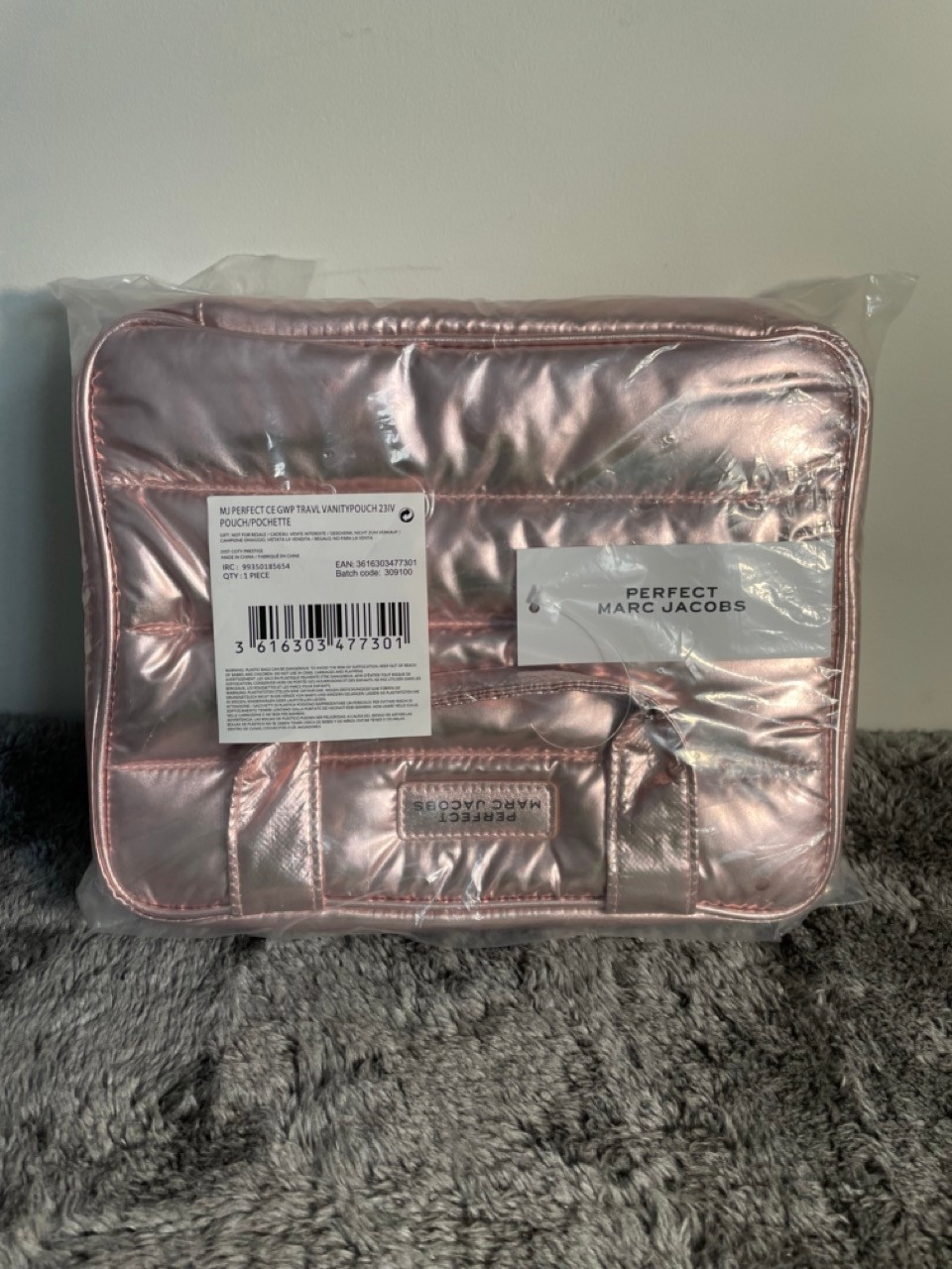 This is a brand new Marc Jacobs Perfect Travel Vanity Pouch in a lovely pink colour! It's still in its original packaging, so it's in perfect condition and ready for your next trip. The pouch is perfect for keeping your cosmetics and toiletries organized while you're on the go