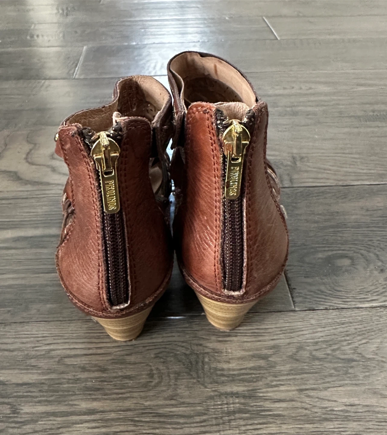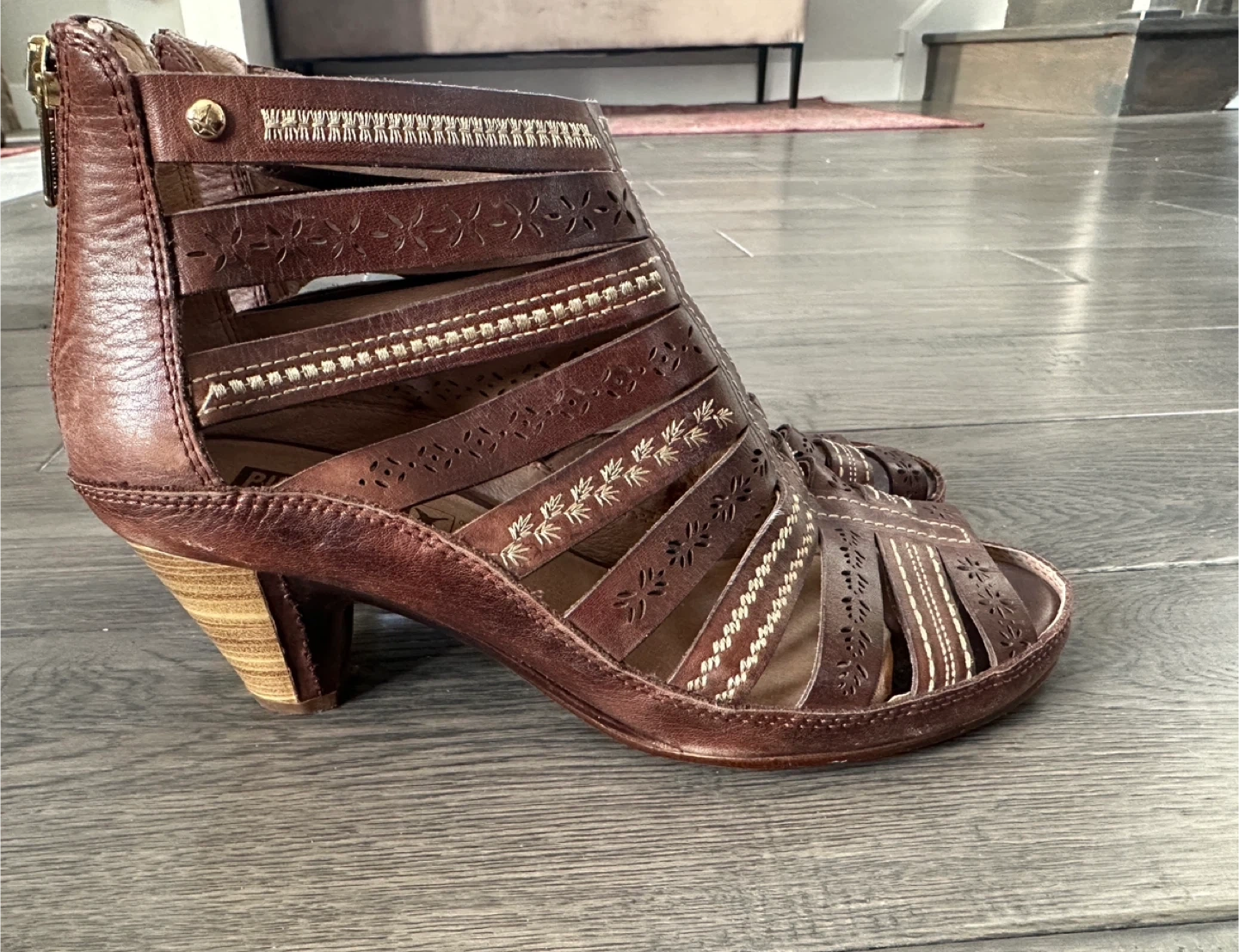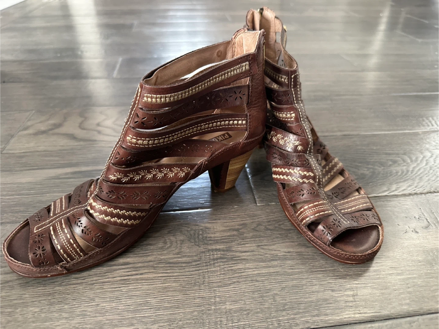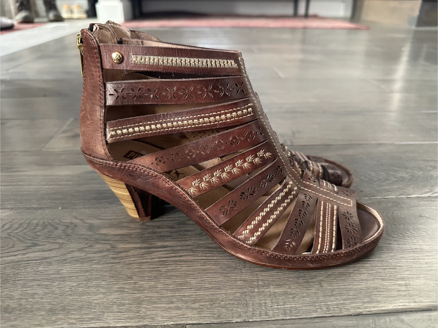 Pikolinos gladiator sandals in a rich brown leather. They feature a stylish cut-out design with decorative stitching and a zip closure at the back. The heel is a comfortable block style. These are perfect for adding a touch of bohemian flair to your summer outfits!