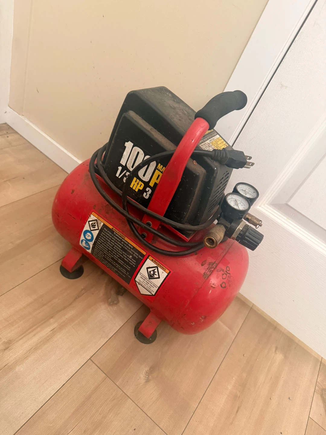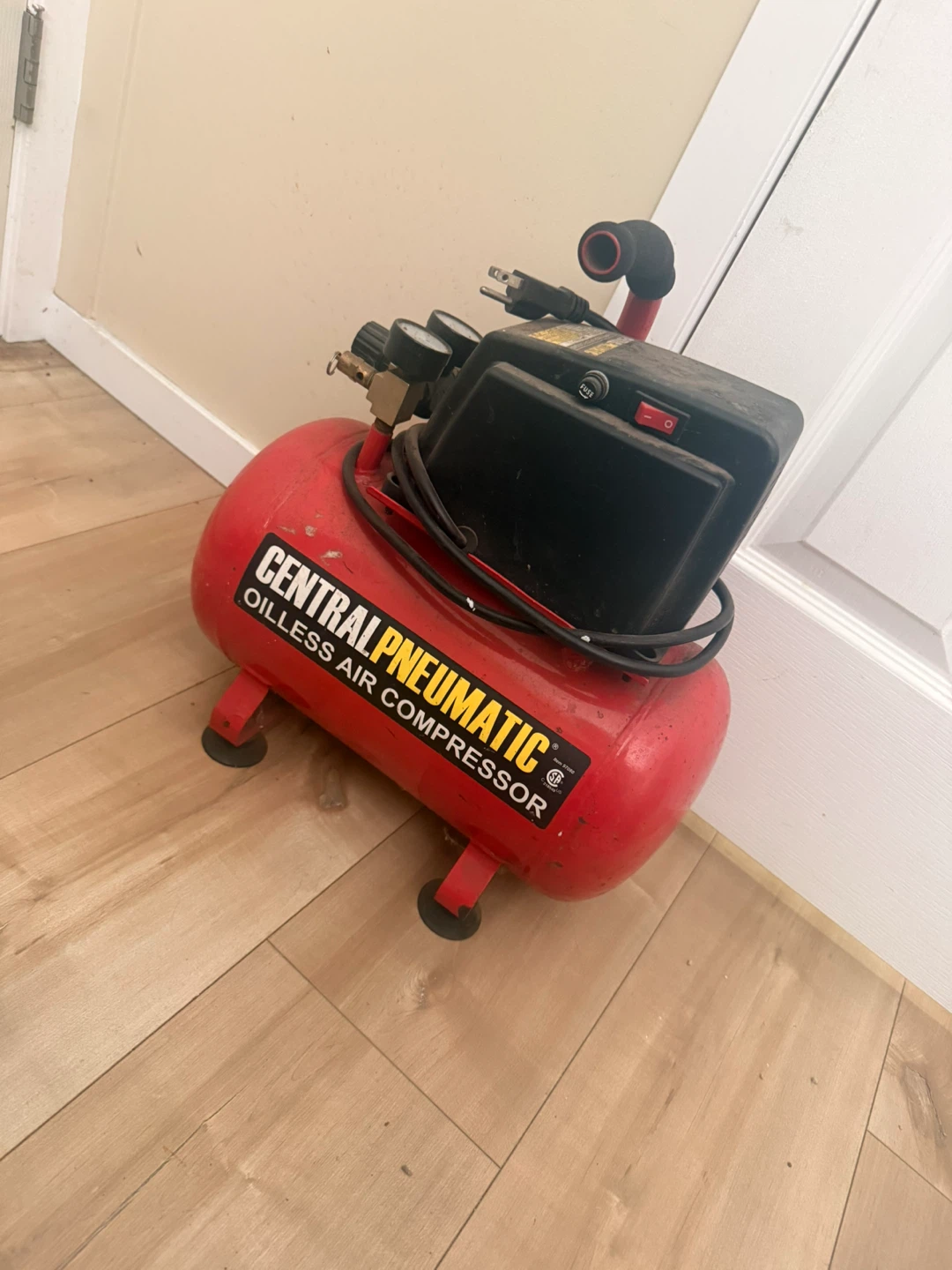 This Central Pneumatic air compressor is oil-less and has a 3-gallon tank. It's powered by a 1/3 HP motor and includes two gauges for pressure monitoring. Great for small inflation tasks!