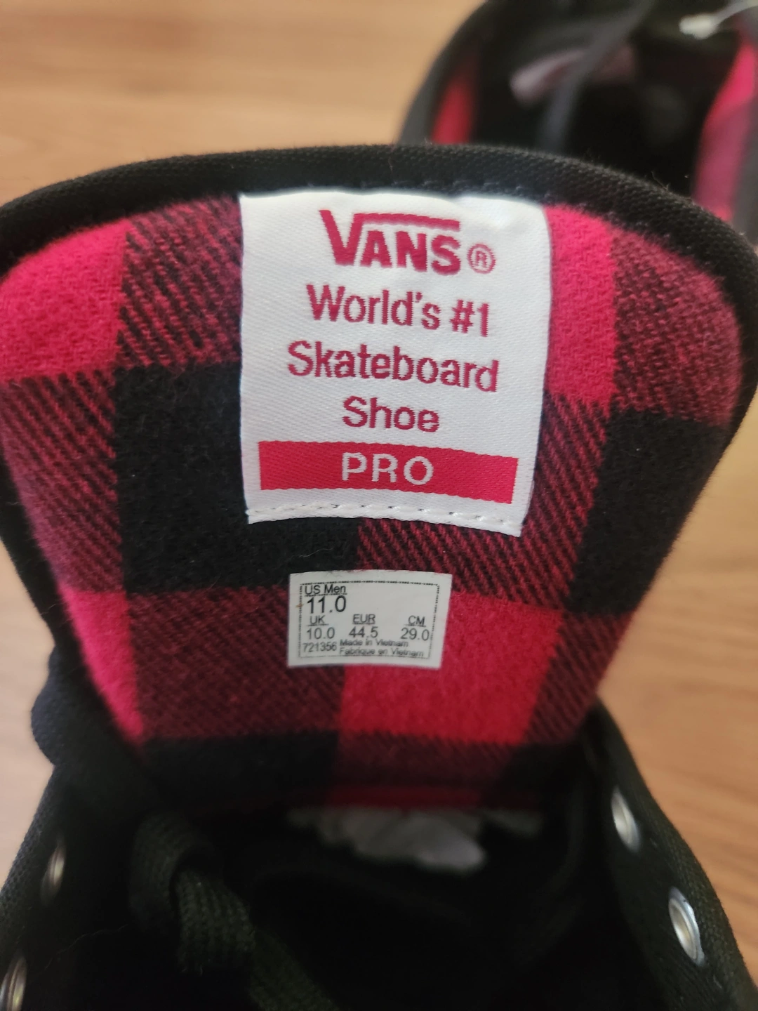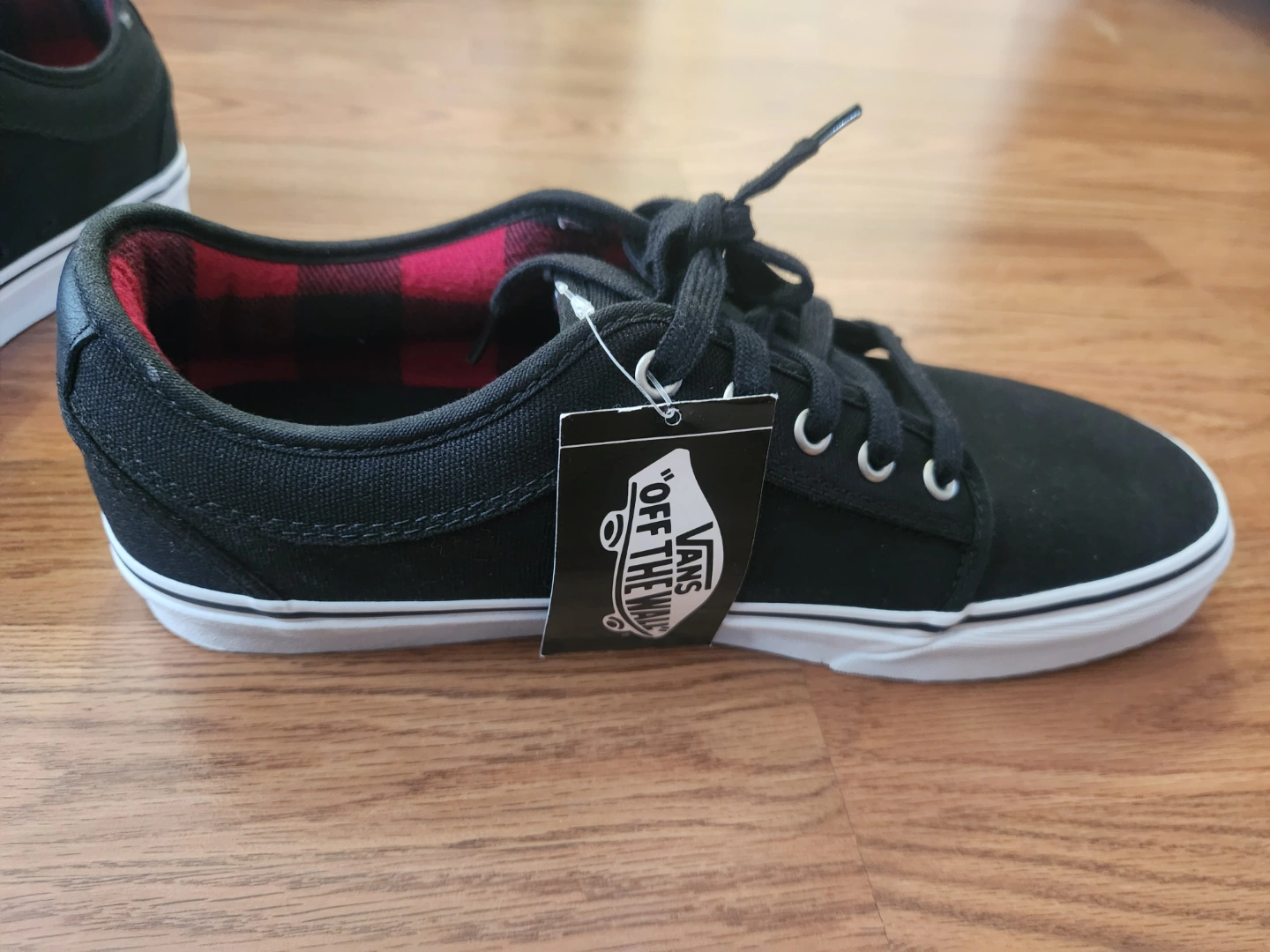 New mens Vans shoes. Black canvas upper, red and black plaid interior. Low-top design. White sole. Great for skating or everyday wear. UltraCush Pro insole.