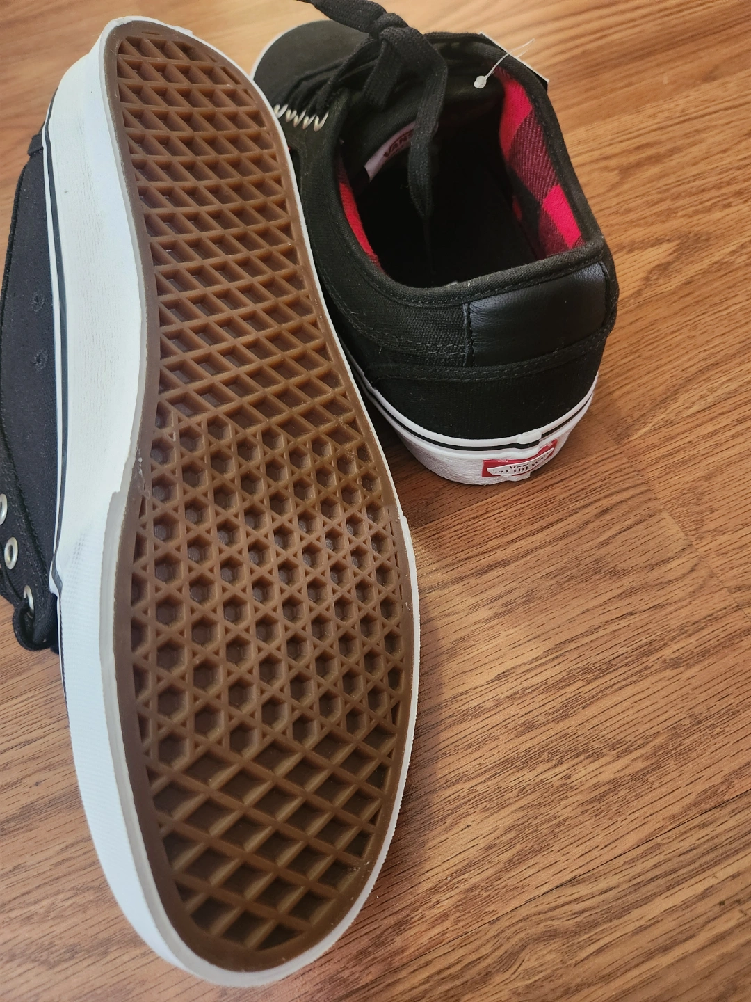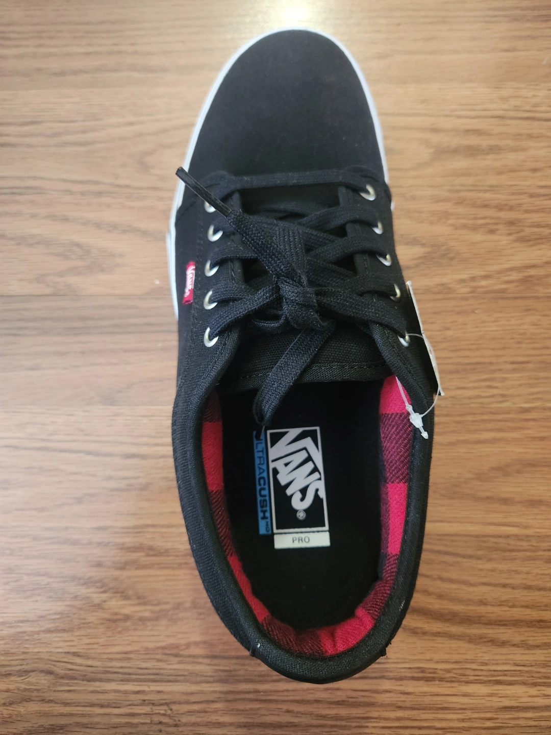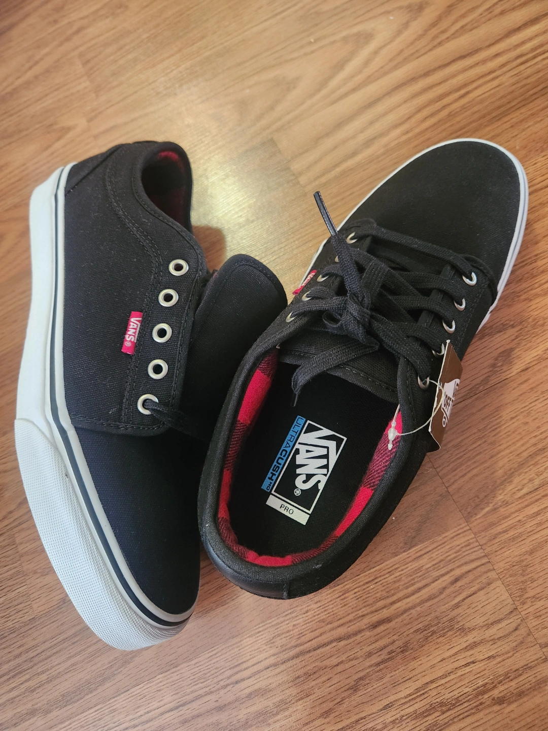 New mens Vans shoes. Black canvas upper, red and black plaid interior. Low-top design. White sole. Great for skating or everyday wear. UltraCush Pro insole.