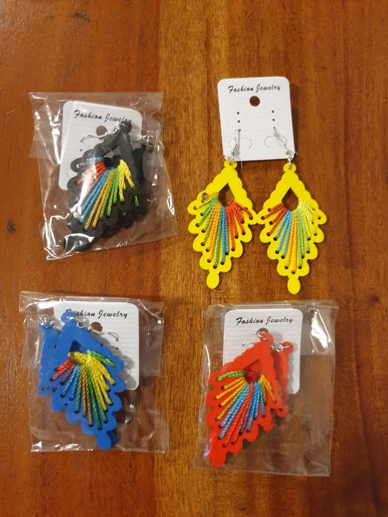 Set of dangle earrings. Each pair has a different colour base. Earrings are made from wood and feature colourful thread. Available in black, yellow, blue and red. Extra light.