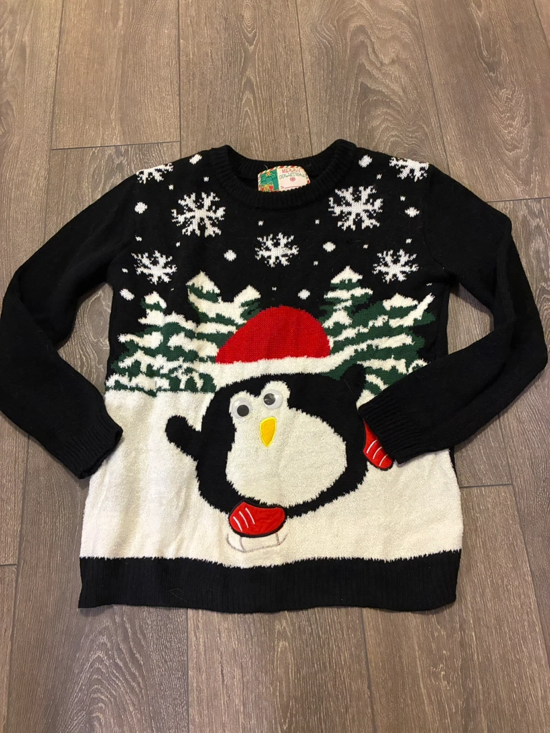 Black long-sleeved Christmas sweater with a festive penguin design. It also makes music but would need the battery to be changed.