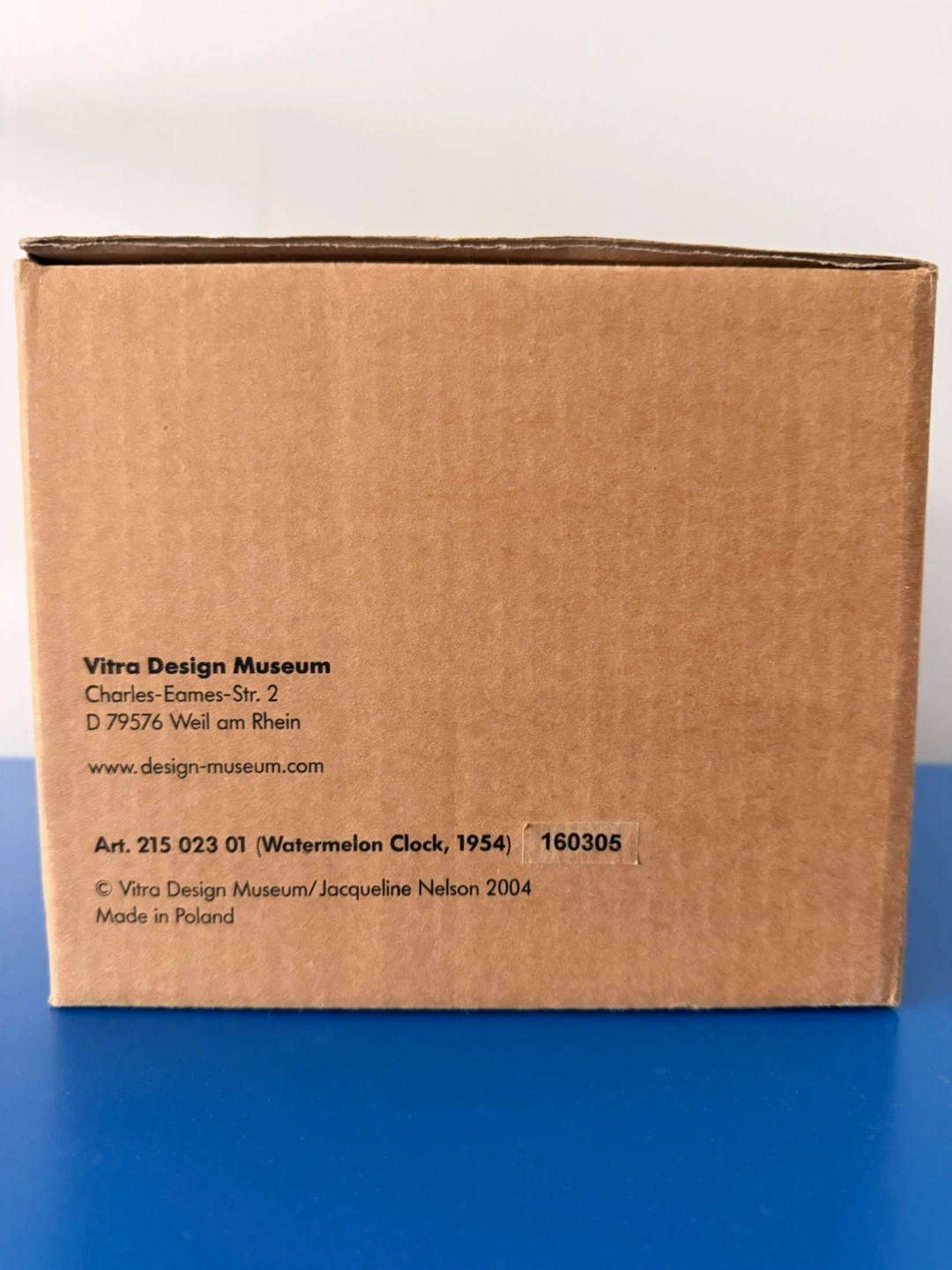 The Watermelon is one of the more unusual Nelson desk clocks, originally conceived in the late 1940s–1950s, and re-issued in limited numbers by Vitra. It’s a collectible piece of mid-century modern design that rarely comes up for sale, especially in this condition and with original box.