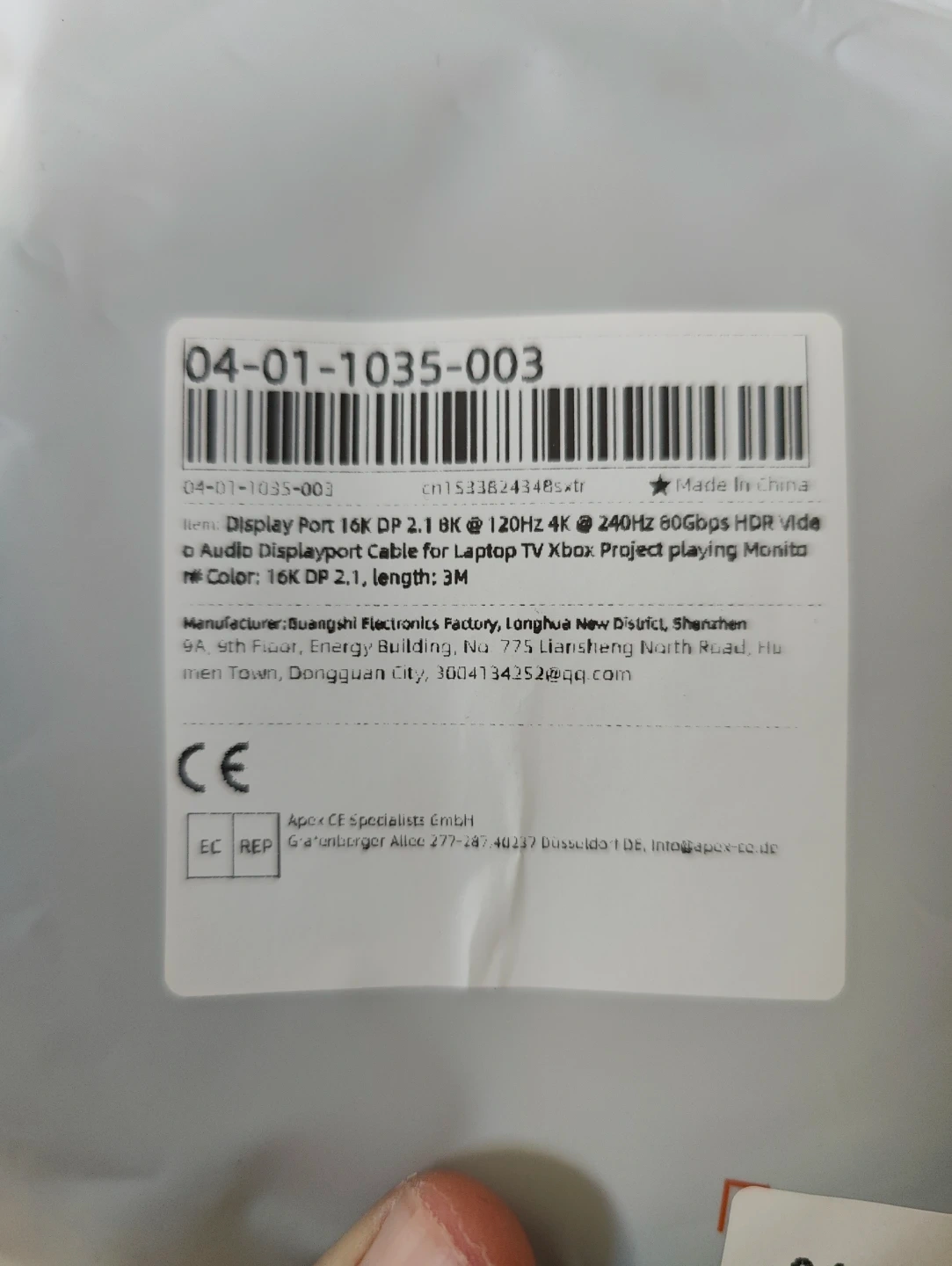 This is a 3-meter DisplayPort cable that supports 8K at 120Hz and 4K at 240Hz with HDR and audio. It's compatible with DP 2.1 for your TV, Xbox, or Projector. DisplayPort cable, 3M length.
