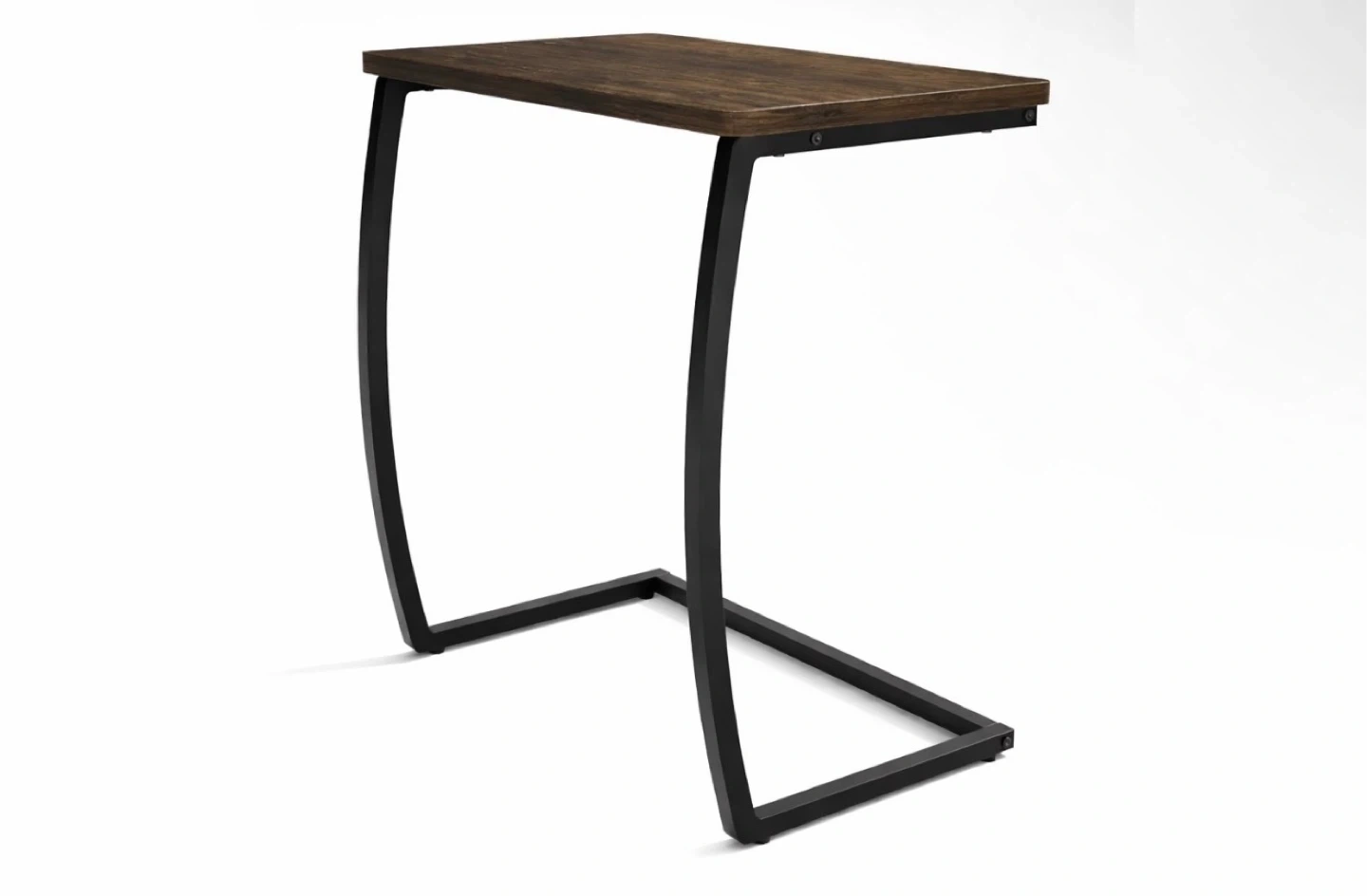 A handy C-shaped side table with a dark wood-look top and a black metal frame. It's a compact table that's great for placing beside a sofa or chair. The metal base has a sleek, modern design.