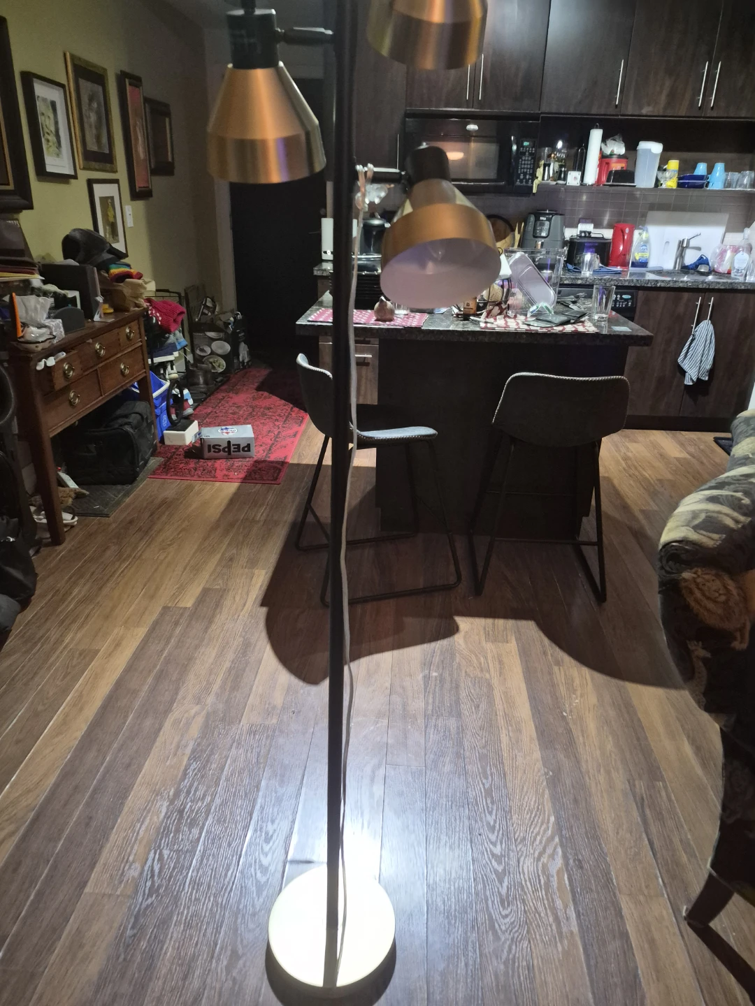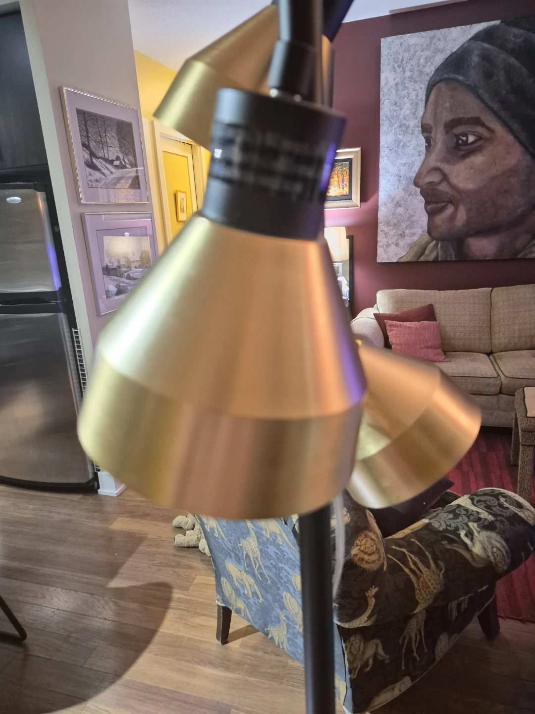 Here's a stylish floor lamp with a black pole and gold-coloured shades. It has multiple lights, perfect for brightening up any room. It's in good condition and ready to light up your space!