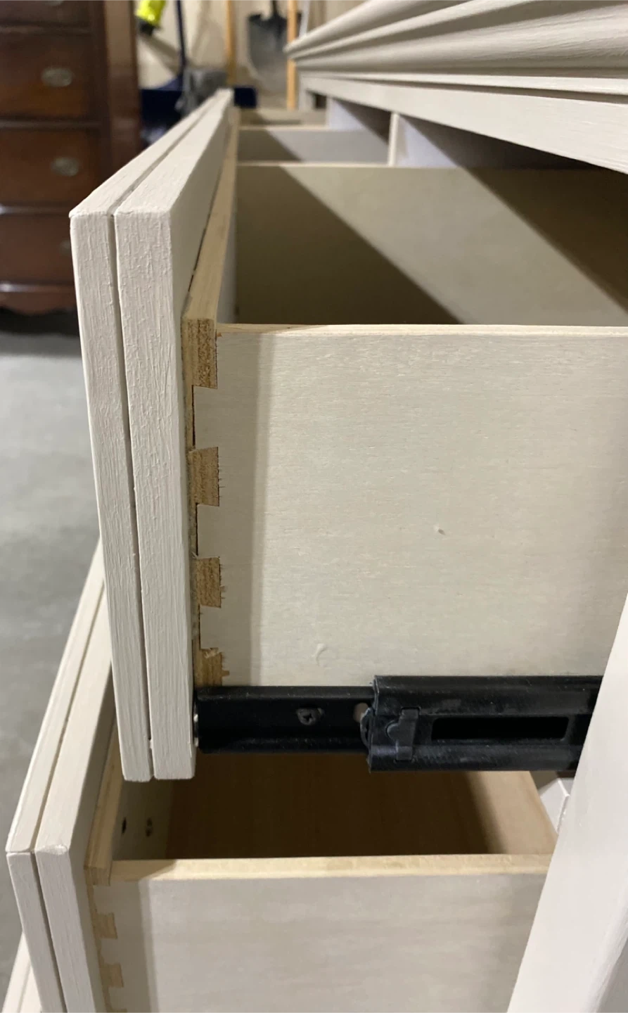 Featuring three dovetailed top drawers with felt lining and four large dovetailed base drawers brand new modern black metal hardware has been added