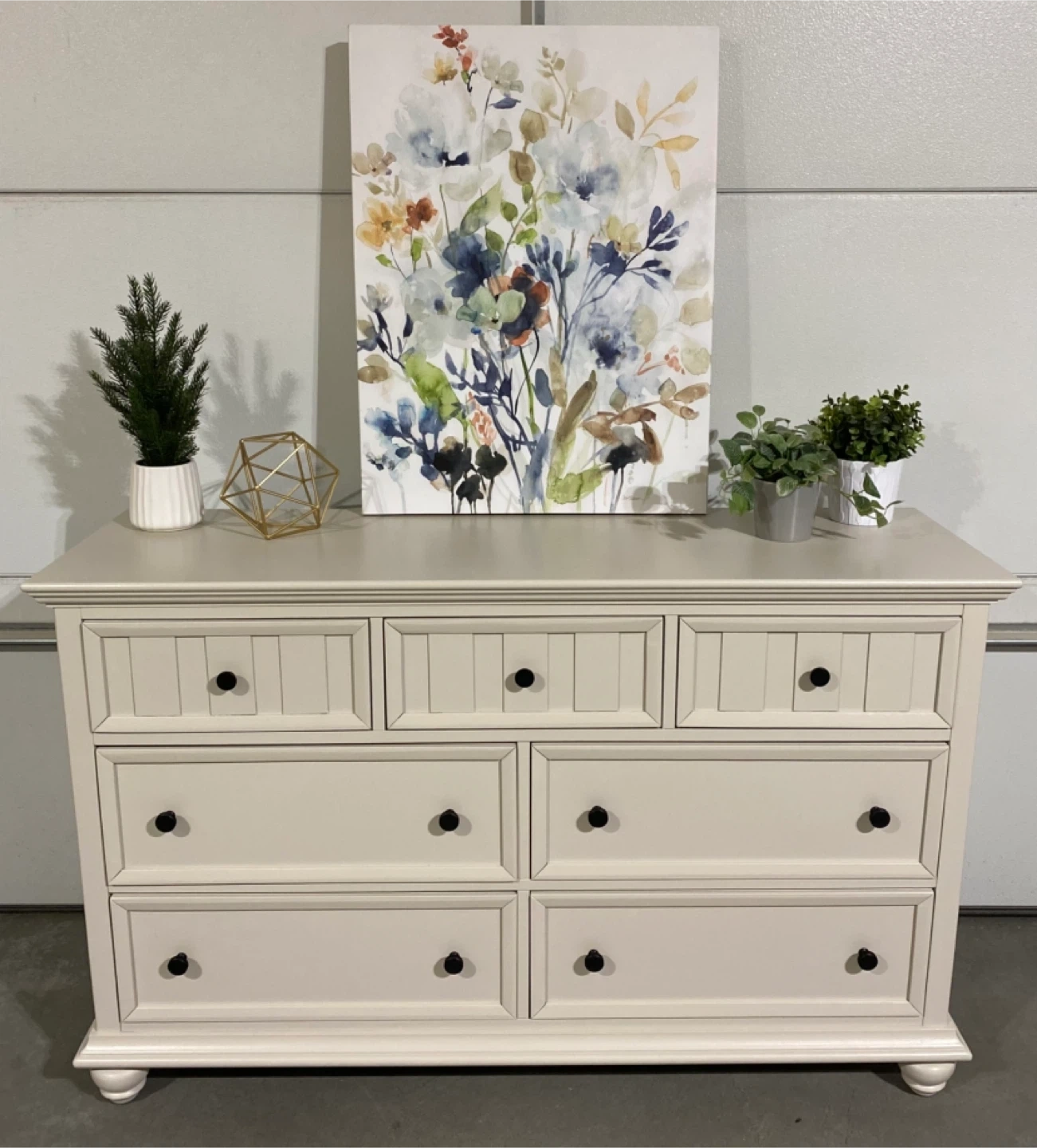 Beautiful modern long hardwood dresser painted in Chateau, a warm Taupe neutral with satin all over topcoatings