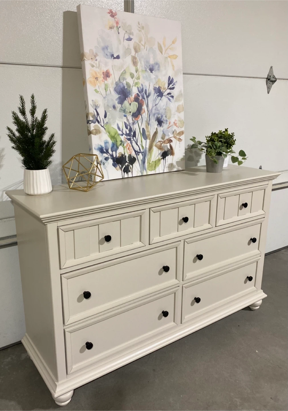 Beautiful modern long hardwood dresser painted in Chateau, a warm Taupe neutral with satin all over topcoatings